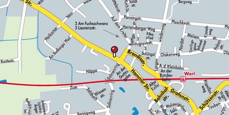 Das Objekt liegt in zentrumsnaher Lage von Werl. In unmittelbarer Nähe befinden sich der Kurpark, das Schulzentrum, Ärzte und Einkaufsmöglichkeiten. Die Werler Fußgängerzone und der Bahnhof liegen ca. 800 m entfernt. Bis zur Anschlussstelle zur A445 sind es lediglich ca. 1,7 km.