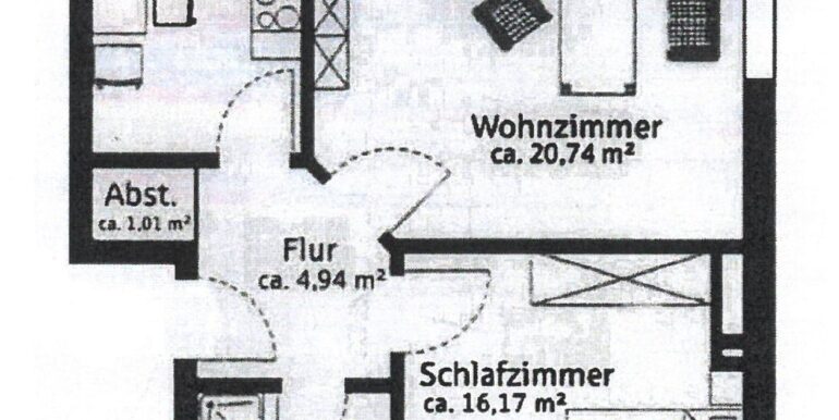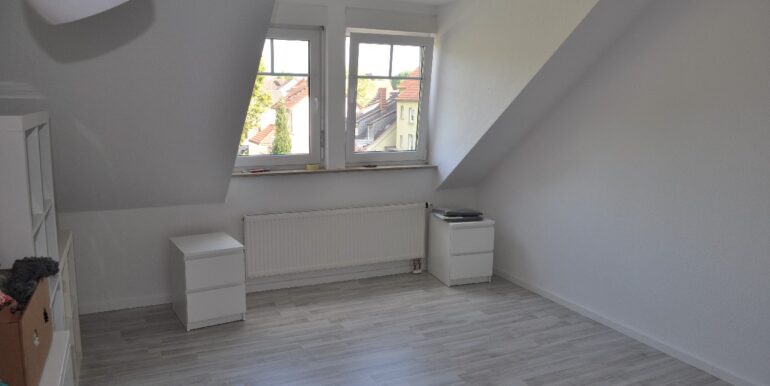 Die Wohnung liegt im Dachgeschoss eines Mehrfamilienhauses mit insgesamt 6 Wohneinheiten. Die ca. 60 m² Wohnfläche teilt sich auf in ein Wohnzimmer mit Zugang zu einer Loggia, ein Schlafzimmer, eine Küche, ein Tageslichtbad mit Dusche und Badewanne, einem Abstellraum und Flur. Die vorhandene Einbauküche wird mitvermietet. Ein Kellerraum und ein PKW-Stellplatz am Haus gehören ebenfalls mit zu der Wohnung.