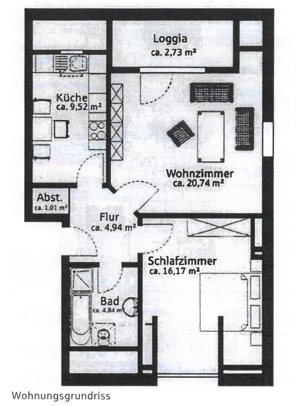Die Wohnung liegt im Dachgeschoss eines Mehrfamilienhauses mit insgesamt 6 Wohneinheiten. Die ca. 60 m² Wohnfläche teilt sich auf in ein Wohnzimmer mit Zugang zu einer Loggia, ein Schlafzimmer, eine Küche, ein Tageslichtbad mit Dusche und Badewanne, einem Abstellraum und Flur. Die vorhandene Einbauküche wird mitvermietet. Ein Kellerraum und ein PKW-Stellplatz am Haus gehören ebenfalls mit zu der Wohnung.