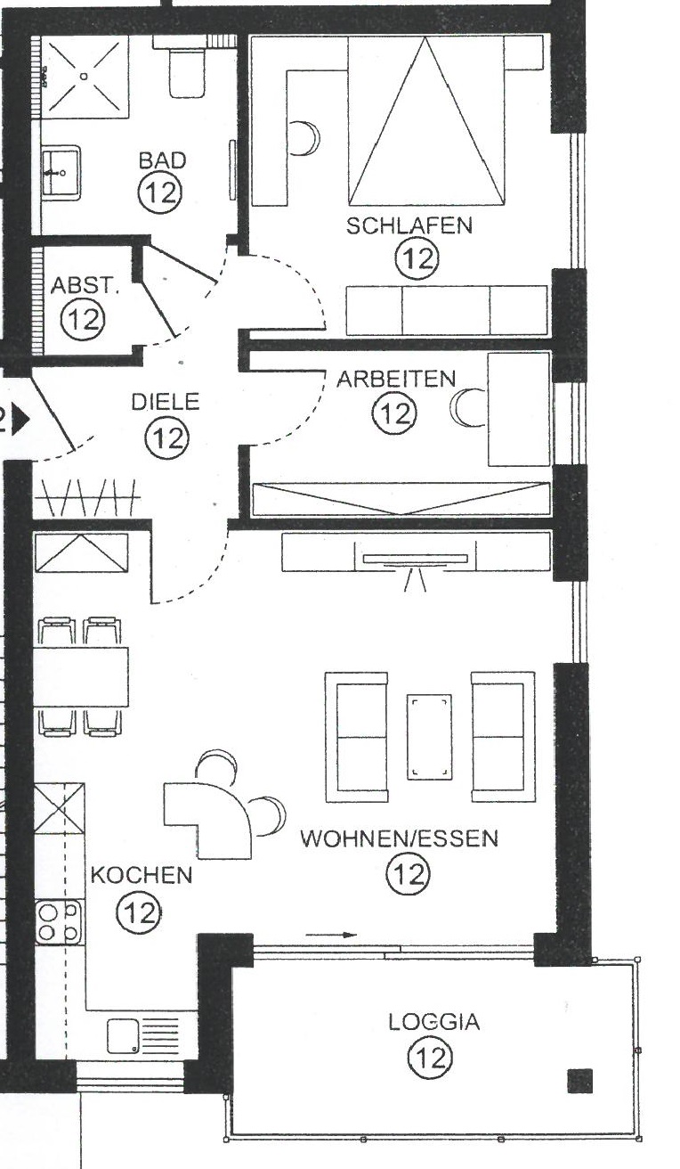 Aufteilung: Offener Wohn-/Essbereich inkl. Einbauküche und Zugang zur Loggia, Schlafzimmer, Arbeitszimmer, Diele, Abstellraum sowie ein Bad mit bodengleicher Dusche. Ein Kellerabteil und ein PKW-Stellplatz runden dieses attraktive Angebot ab
