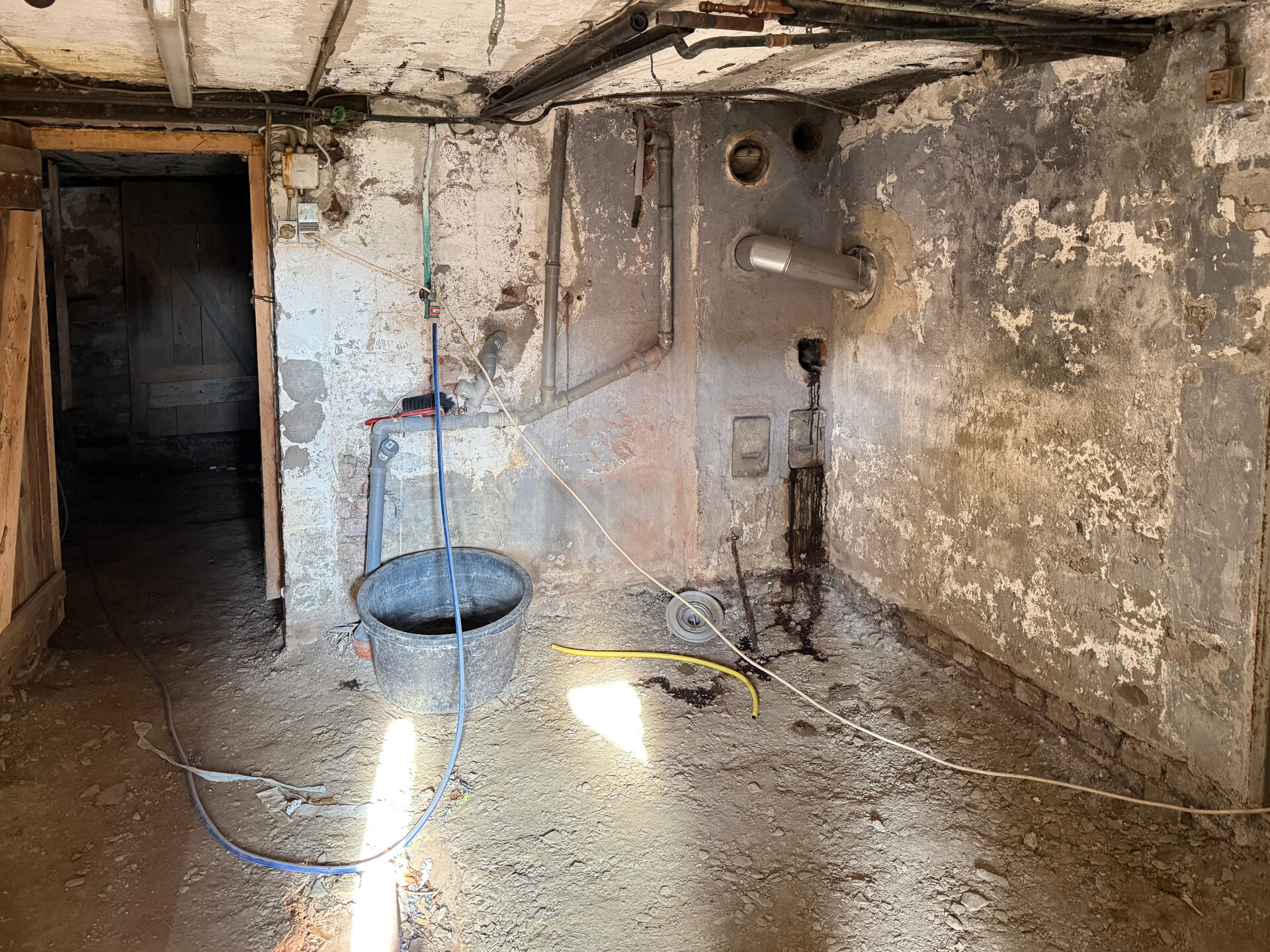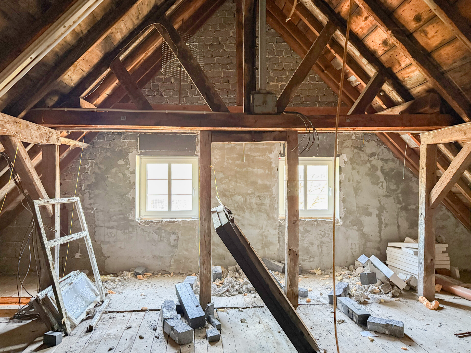Bei dieser Immobilie handelt es sich um ein ehemaliges Bauernhaus aus schätzungsweise 1919, das seit 2022 bereits im Außenbereich saniert wurde. Im Zuge der Sanierung wurden die Fassade, das Dach sowie die Fenster erneuert. Im linken Gebäudebereich befindet sich eine kleine, bezugsbereite Wohnung, bestehend aus Küche, Wohnzimmer, Duschbad und Schlafzimmer. Der Innenbereich des rechten Gebäudeteils befindet sich im entkernten Zustand. Sämtliche Innenausbauten wurden entfernt, das Gebäude präsentiert sich im Rohbauzustand mit freigelegten Wänden, Decken, Böden. Erste Arbeiten an der Elektrik wurden bereits begonnen, jedoch noch nicht abgeschlossen. Die Elektrioverteilung im OG wurde komplett verlegt. Es bietet vielfältige Ausbaureserven zur individuellen Gestaltung von zusätzlichem Wohnraum. Ursprünglich war der Ausbau zu einem Mehrfamilienhaus mit 2 weiteren Einheiten vorgesehen, wodurch sich das Objekt besonders für handwerklich versierte Käufer oder Investoren eignet, die den verbleibenden Sanierungsaufwand bewusst einkalkulieren. Nach Fertigstellung könnte eine Wohnfläche von schätzungsweise 350 m² erzielt werden.