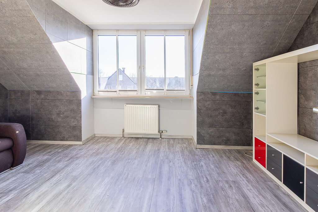 Das Dachgeschoss überzeugt mit zwei weiteren Zimmer. Die Räume können auch geöffnet werden, sodass ein großes helles Studio entsteht. In einem separatem Abstellraum ist die Zentralheizung untergebracht. Der Spitzboden wird über eine Auszugstreppe erreicht.