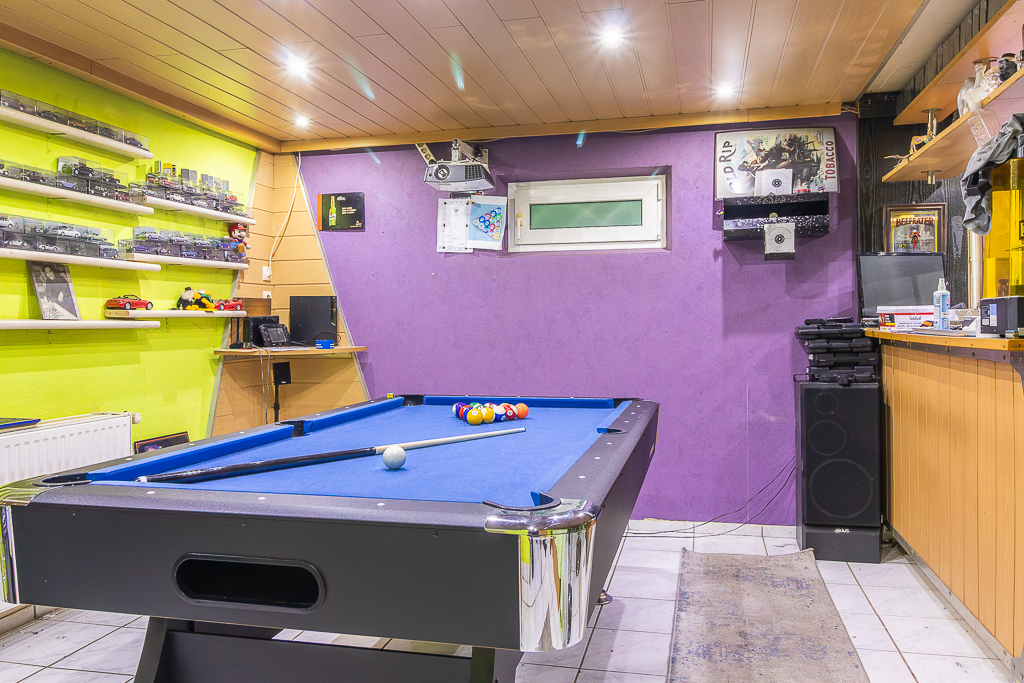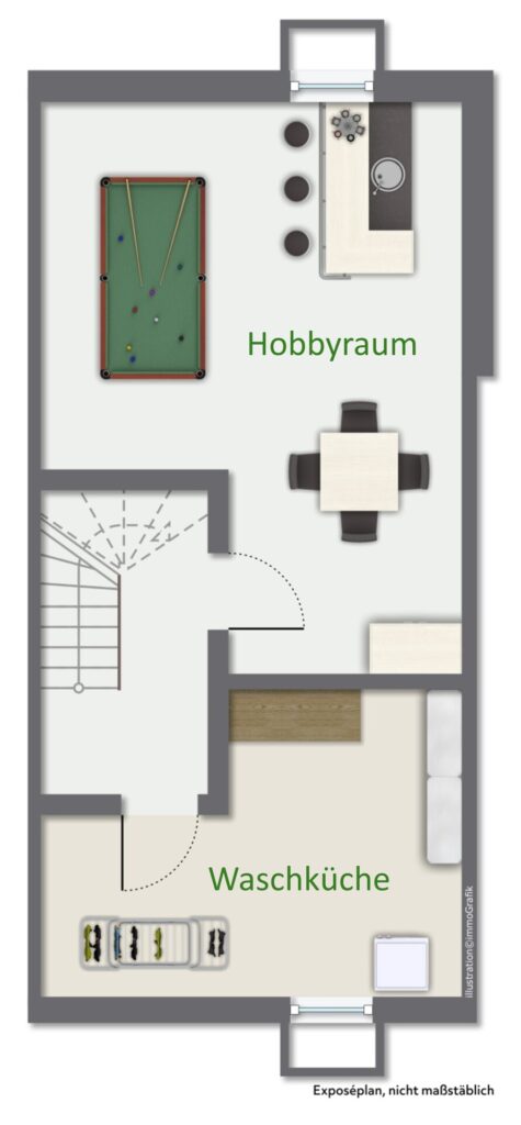 Der Keller bietet weiteren Nutzraum: Eine Diele, ein Hobbyraum mit Bar, ein kleiner abgetrennter Werkraum sowie eine Waschküche stehen zur Verfügung.