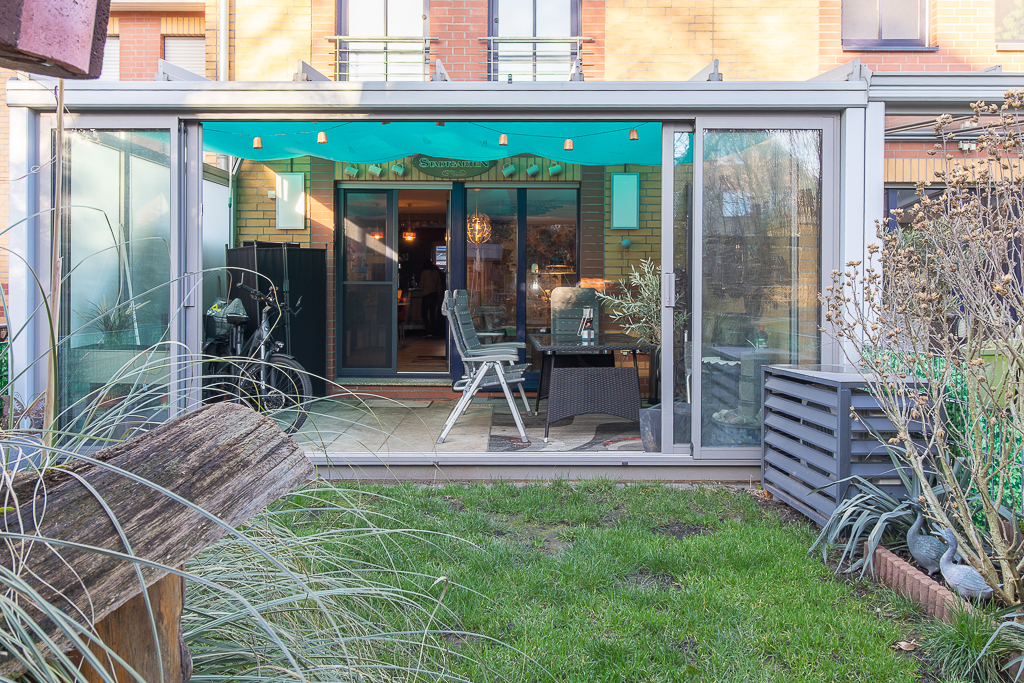 Der Zugang zum Haus führt über eine Stufen in das Erdgeschoss, das sich in eine Diele, ein Gäste-WC, die offene Küche sowie das großzügige Wohnzimmer gliedert. An dieses wurde vor Kurzem ein hochwertiger Wintergarten angebaut, der den Wohnbereich erweitert und ein lichtdurchflutetes Ambiente schafft.