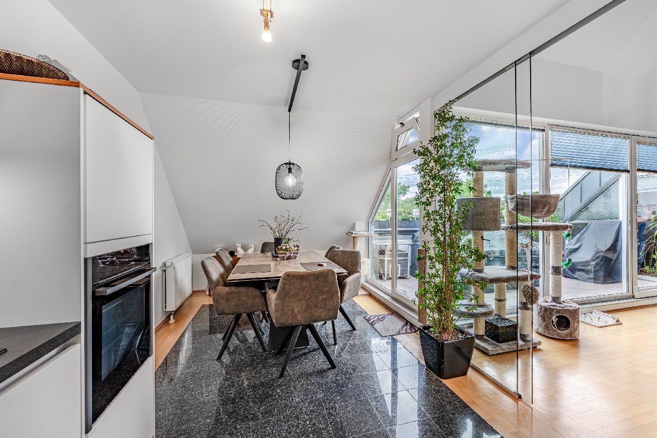 Eine filigrane Wendeltreppe führt ins Galeriegeschoss. Hier beeindruckt besonders der offene Galeriebereich mit Blick in das darunterliegende Geschoss – die großzügige Deckenhöhe und der Lichteinfall schaffen ein luftiges, beinahe loftartiges Wohngefühl. Das Galeriegeschoss beherbergt ein geräumiges Elternschlafzimmer mit praktischen Einbauschränken sowie ein Tageslichtbad mit Dusche und Eckbadewanne. Ein weiterer, ursprünglich als Kinder- oder Gästezimmer geplanter Raum wird als private Sauna und Ruhezone genutzt. Ein Rückbau zur Nutzung als Büro oder Kinderzimmer ist auf Wunsch ohne großen Aufwand möglich. Von hier aus gelangen Sie direkt auf den zweiten, uneinsehbaren Balkon mit weitem Blick ins Grüne. Ein Rückzugsort mit echter Wellness-Qualität. Ein kleiner Abstellraum in der Dachschräge komplettiert die Wohneinheit.