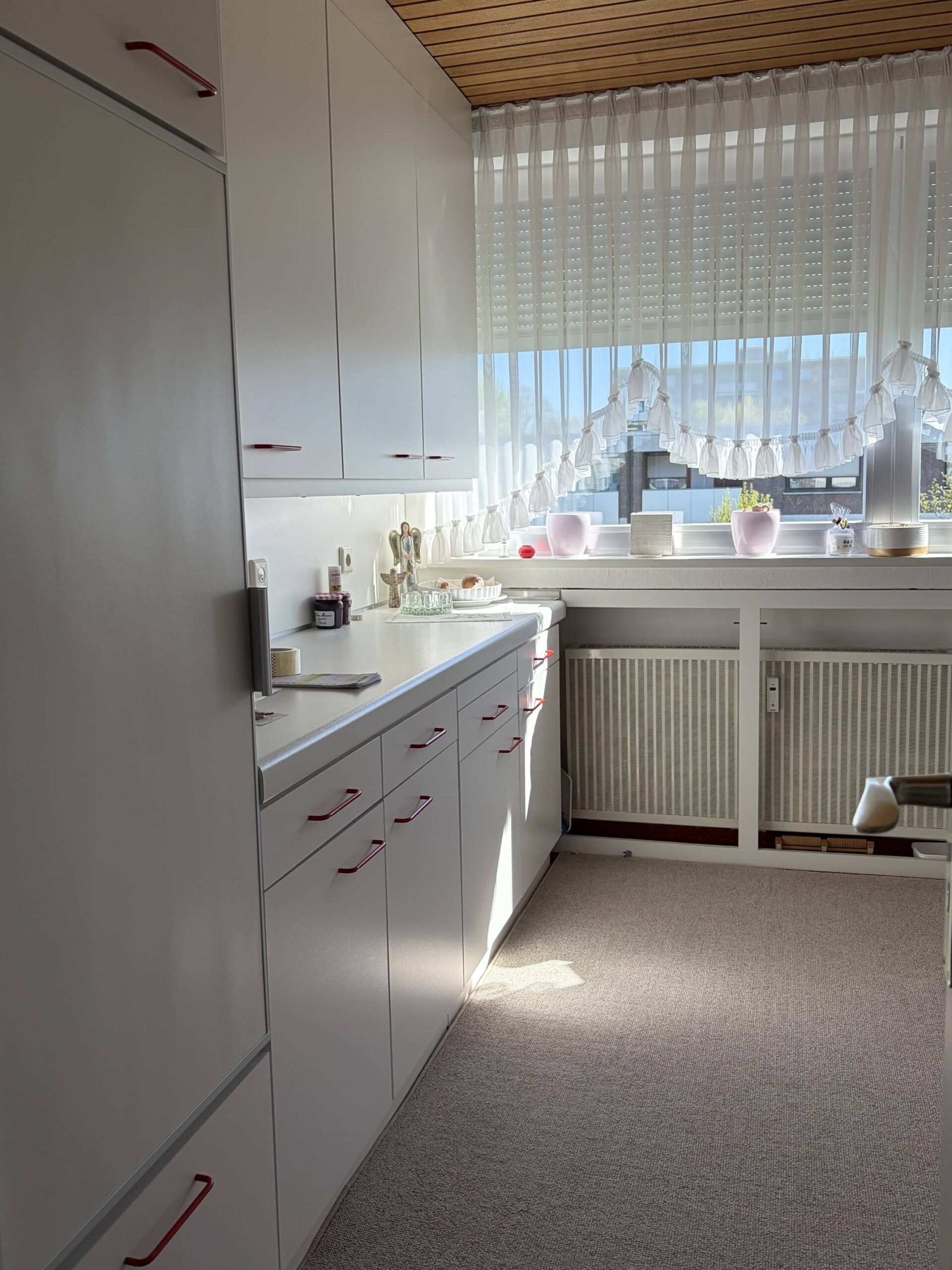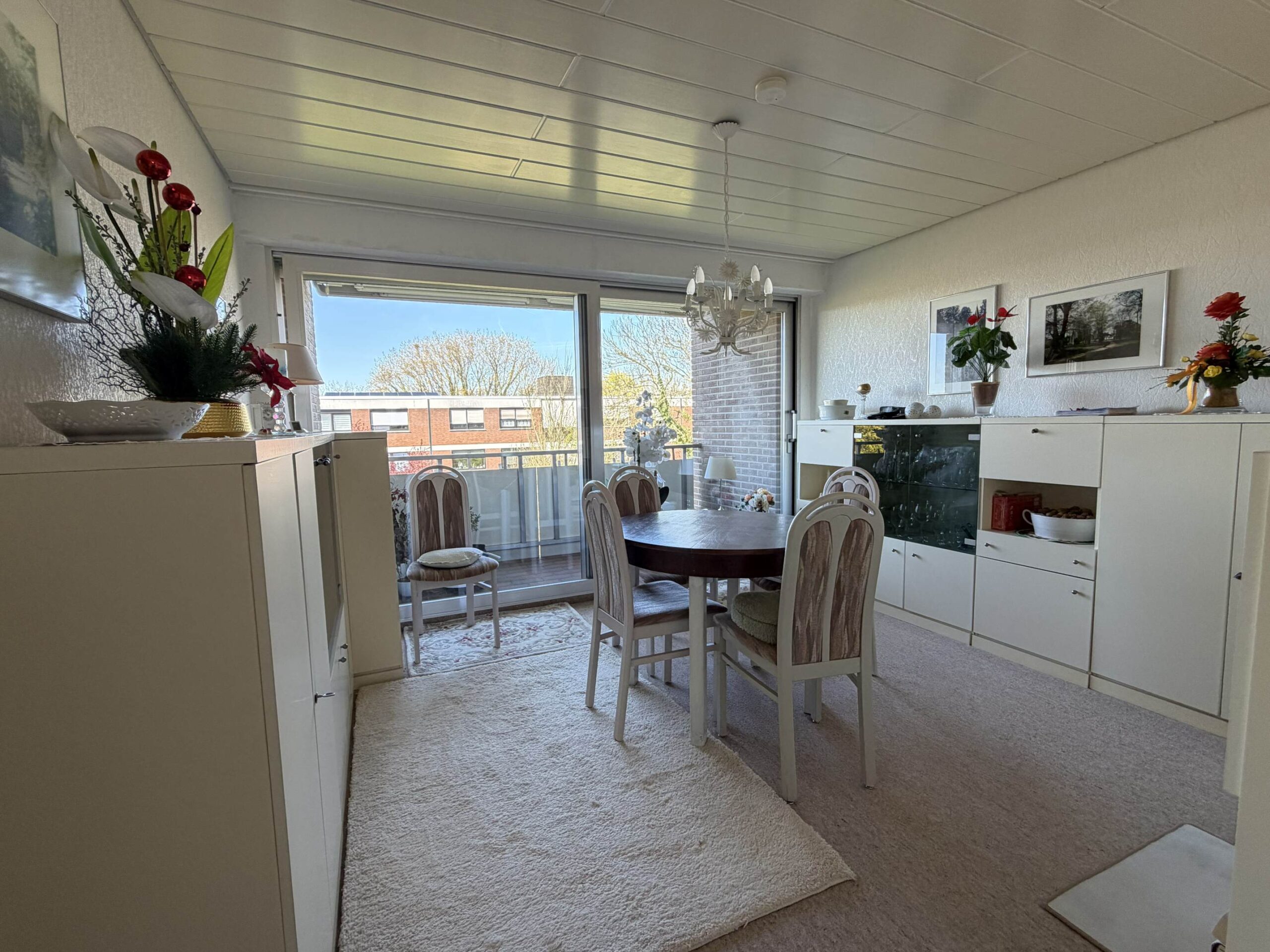 Die Wohnung präsentiert sich hell und gepflegt. Zur Ausstattung zählen u.a. Teppichboden in allen Räumen, Raufasertapeten, doppelt verglaste Aluminiumfenster mit Außenrollos (teilweise elektrisch), Loggia mit Markise, weiße Holzdecken sowie Innentüren und eine moderne Wohnungseingangstür. Das Badezimmer stammt aus dem Baujahr, wurde jedoch optisch etwas überarbeitet. Es ist mit weiß gestrichenen Fliesen, einer Badewanne sowie einem Bidet ausgestattet.