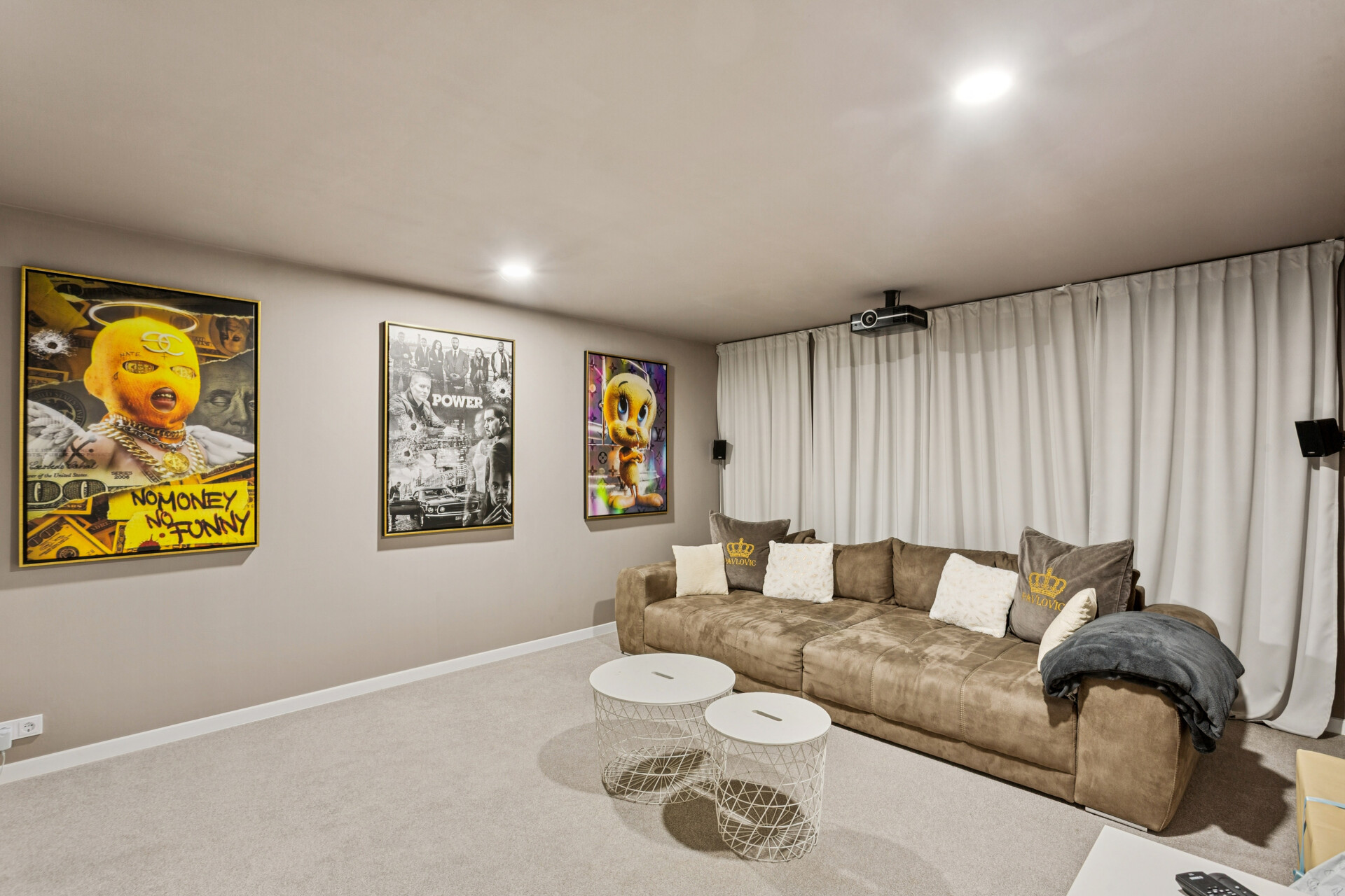 Besonders hervorzuheben ist die exklusive Design-Küche, ausgestattet mit modernster Premium-Technik. Das Quooker Pro 3 System liefert auf Knopfdruck gefiltertes, sprudelndes, kochendes oder normales Trinkwasser und setzt ein klares Highlight im täglichen Komfort. Ebenso beeindruckend ist das hauseigene Heimkino, das unvergessliche Filmabende garantiert.