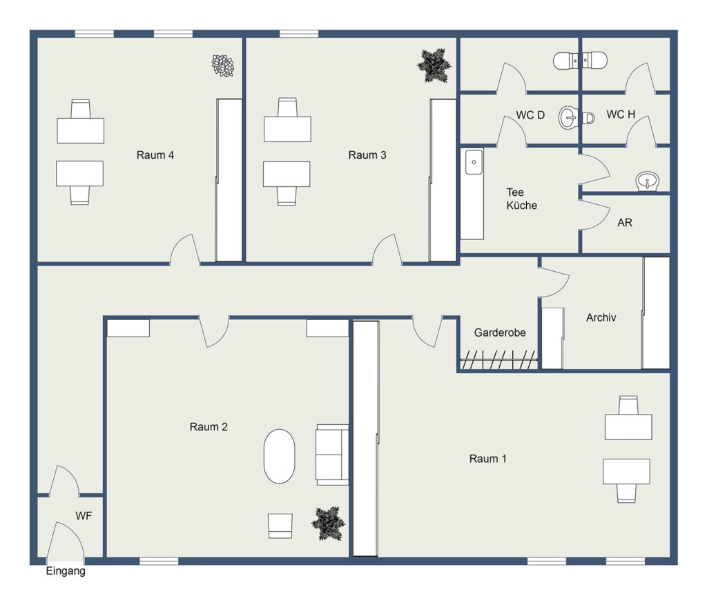 Aufgeteilt in helle 4 Büroräume, besteht jedoch die Möglichkeit, Raum 2 in einen großen Empfangsbereich zu ändern.