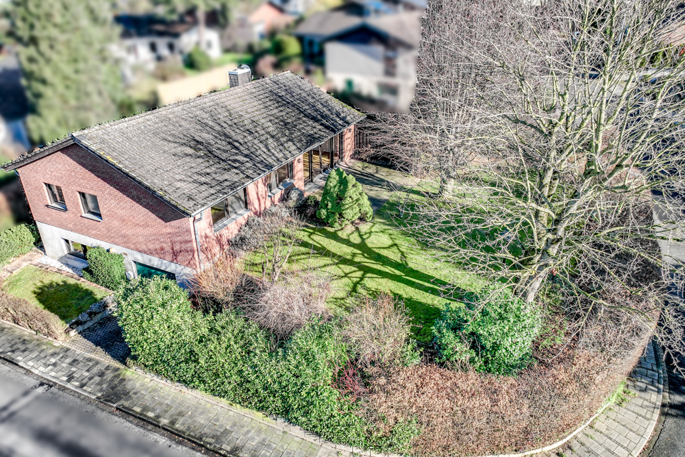 Das zum Verkauf stehende Einfamilienhaus befindet sich auf dem Eck-Grundstück der Straße ‚Am Grünen Berg‘ und dem ‚Ahornweg‘. Es umfasst ein massiv errichtetes Souterrain-Geschoss und die Hauptwohnetage mit angrenzendem Garten.