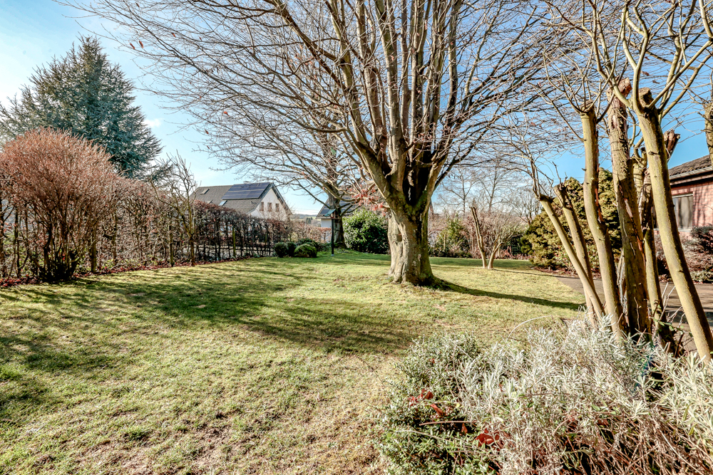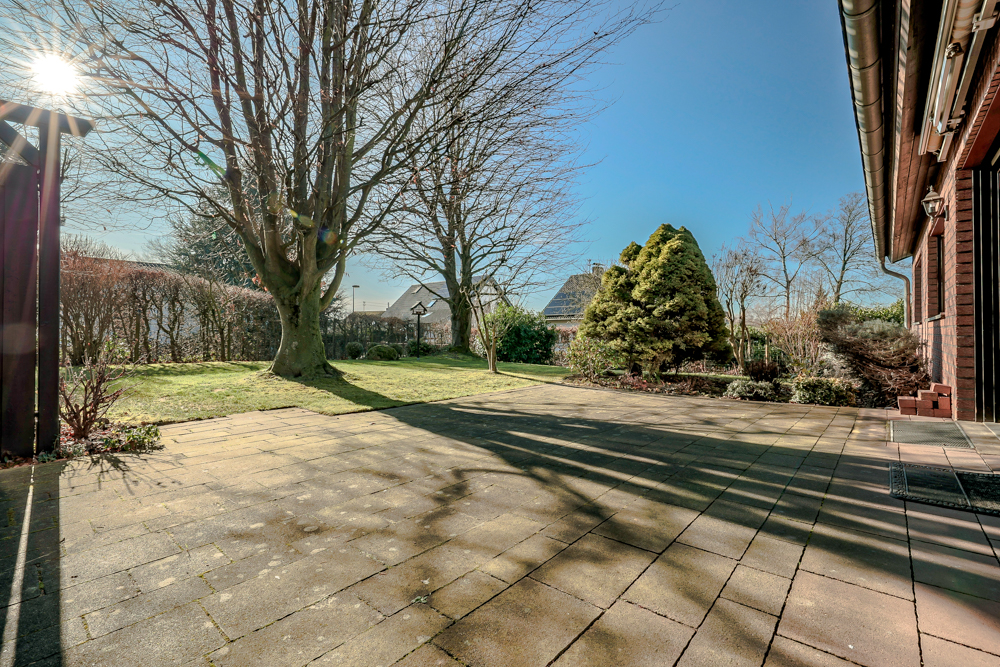 Die nach Süden ausgerichtete Terrasse (mit Markise) betreten Sie über den Wohnbereich. Die angrenzende Gartenfläche ist von Hecken umschlossen. Ein kleines Gartentörchen ermöglicht das Betreten des Gartens über den Ahornweg.