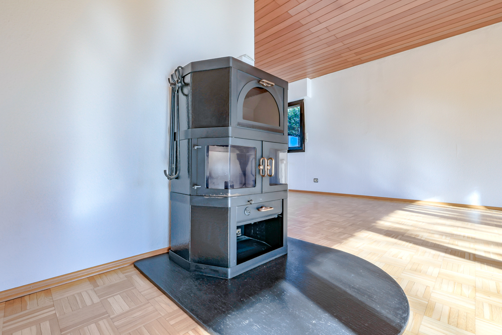 *Großer Wohn-Essbereich mit Parkettboden, Kaminofen und Panoramafensterscheiben zur Terrasse,