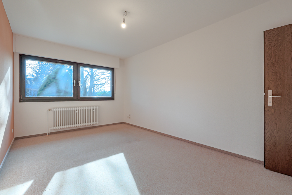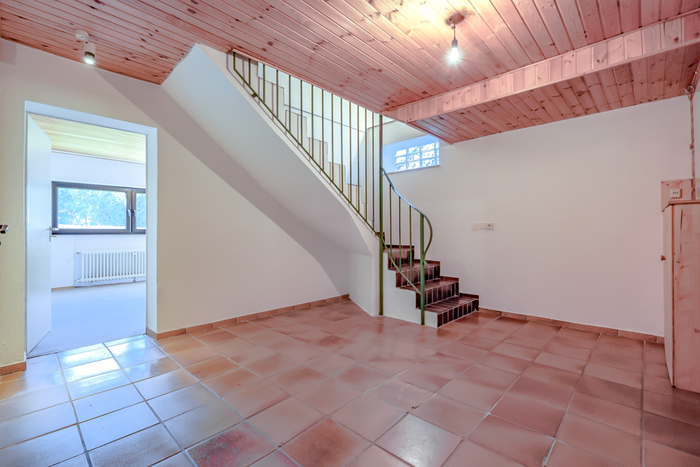 Eine innenliegende Treppe verbindet das Erdgeschoss mit dem Souterrain-Geschoss. Hier gibt es ein weiteres vollwertiges Schlafzimmer, ein Duschbad mit Waschmaschinenanschluss sowie den Heizungskeller, einen großen Hobbyraum, ebenfalls mit Waschmaschinenanschluss, und einen Vorratskeller.