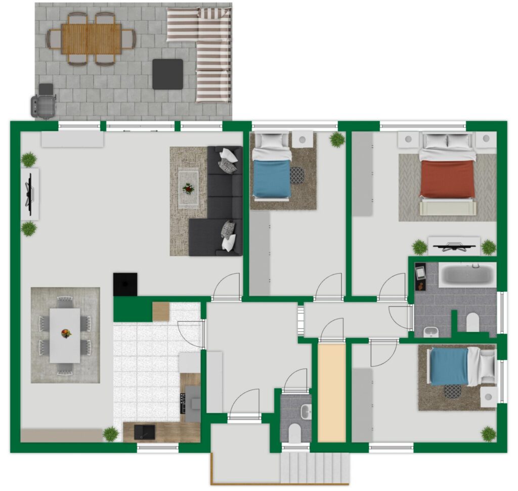 Sie gelangen in die Hauptwohnetage, nachdem Sie über die Straße ‚Am Grünen Berg‘ über eine Außentreppe den Hauseingang betreten haben.