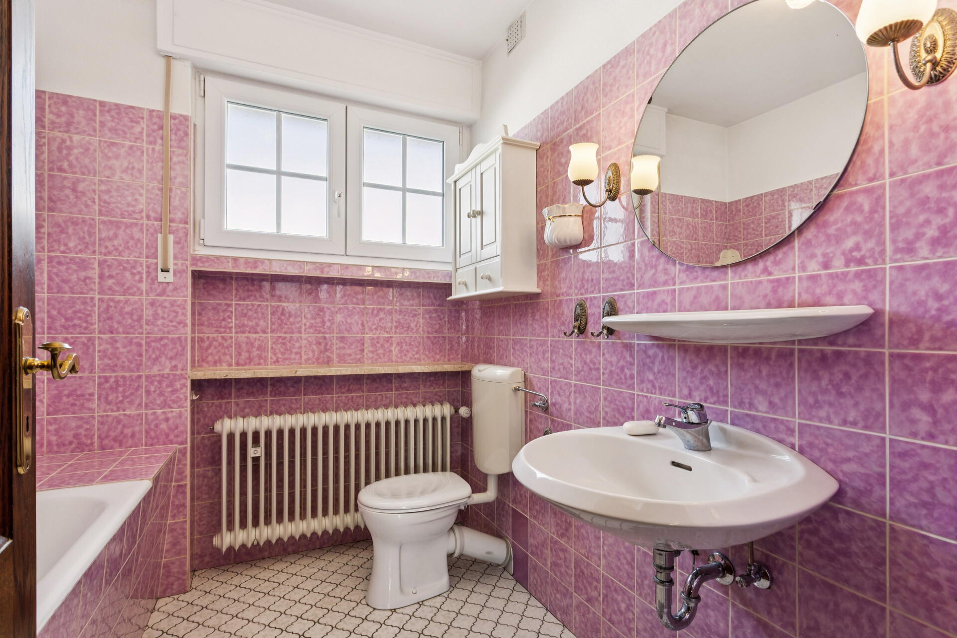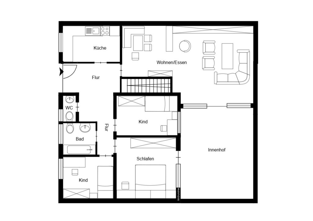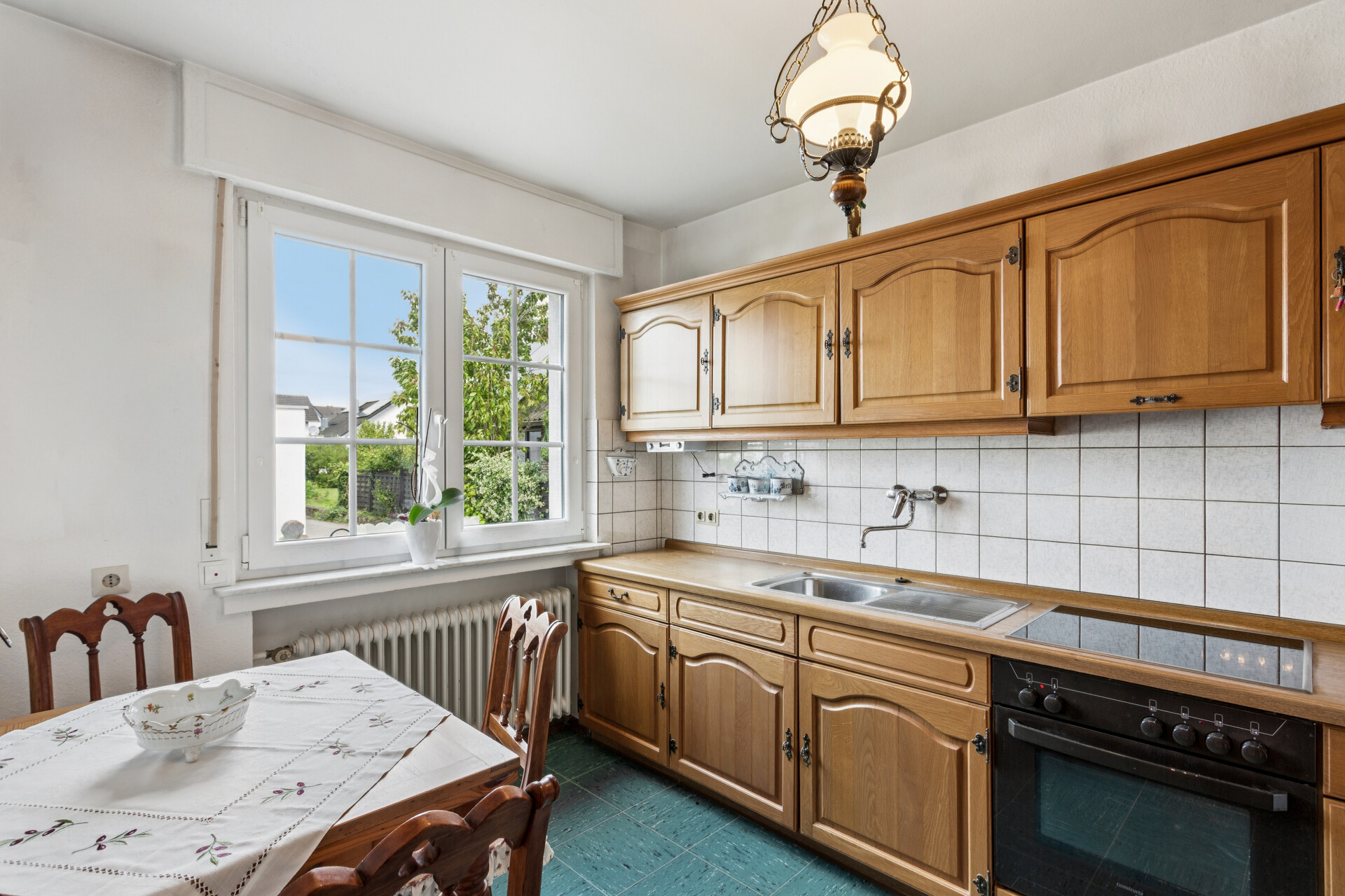 Die geräumige Küche bietet Platz für entspannte Kochabende. Da sie genügend Platz für einen Esstisch bietet, kann das aktuelle Esszimmer problemlos anderweitig genutzt werden. Gegenüber des aktuellen Esszimmers befindet sich das Gäste-WC und gegenüber vom Schlafzimmer das Badezimmer mit Badewanne. Beide Bäder verfügen über ein Tageslichtfenster.