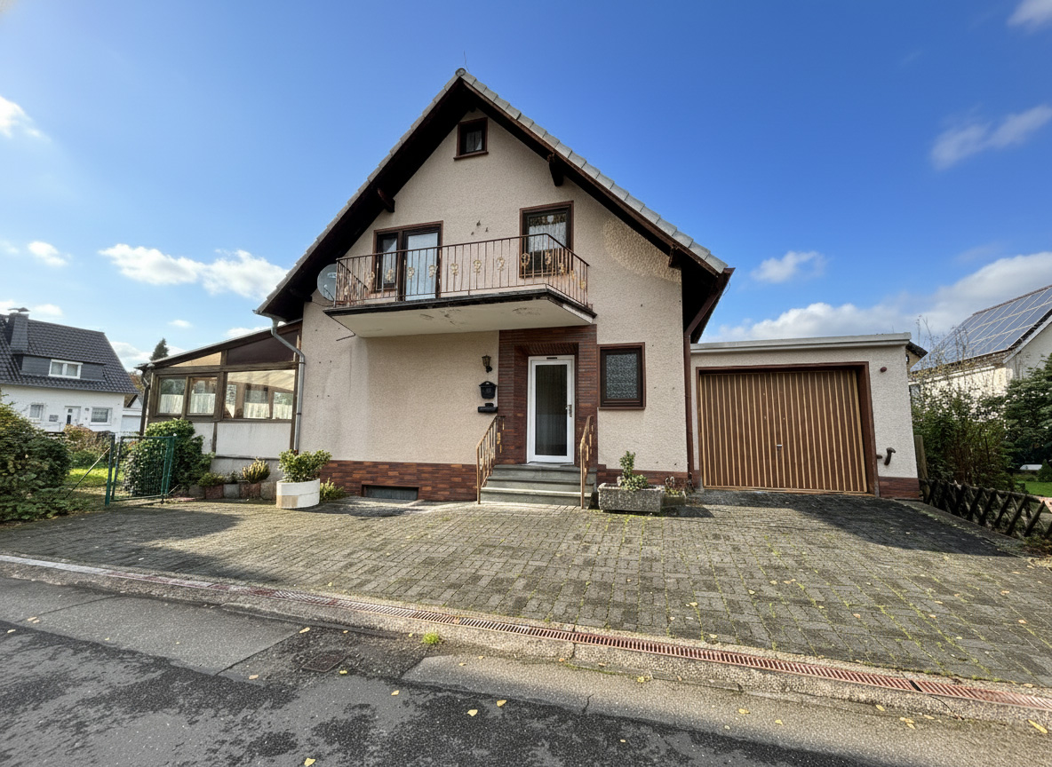 Diese Immobilie wurde ca. im Jahr 1975 in massiver Bauweise auf einem ca. 609 m² großen Grundstück errichtet und bietet vielseitige Nutzungsmöglichkeiten. Das Einfamilienhaus verfügt über eine gut durchdachte Raumaufteilung mit einer Wohnfläche von ca. 115 m², verteilt auf das Erd- und Obergeschoss mit insgesamt fünf Zimmern. Im Erdgeschoss befinden sich ein Gäste-WC, ein großzügiges Wohnzimmer, ein Esszimmer mit Zugang zum geräumigen Wintergarten sowie zum Garten und eine Küche. Das Obergeschoss umfasst zwei Schlafzimmer, ein weiteres, kleineres Zimmer sowie ein Badezimmer. Zusätzlichen Stauraum bietet das Untergeschoss, in dem sich unter anderem zwei ausgebaute Kellerräume und ein weiteres WC befinden. Der pflegeleichte Garten lädt mit seinem idyllischen Teich zum Entspannen und Verweilen ein. Hier genießen Sie erholsame Stunden, ohne großen Arbeitsaufwand betreiben zu müssen. Das Objekt befindet sich in einem renovierungsbedürftigen Zustand, bietet jedoch erhebliches Potenzial zur individuellen Gestaltung und Wertsteigerung.