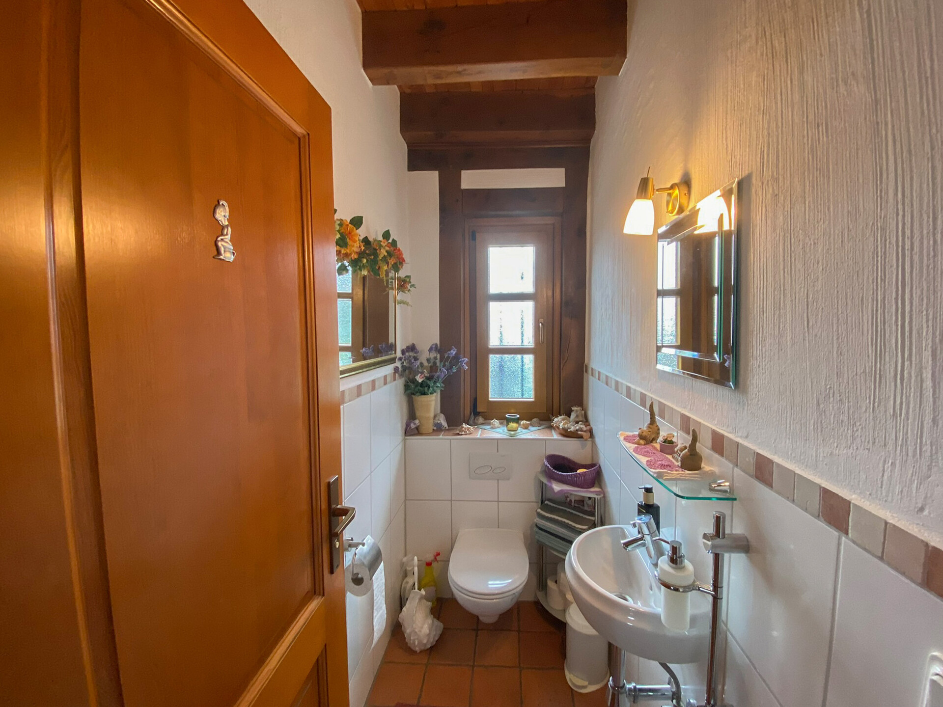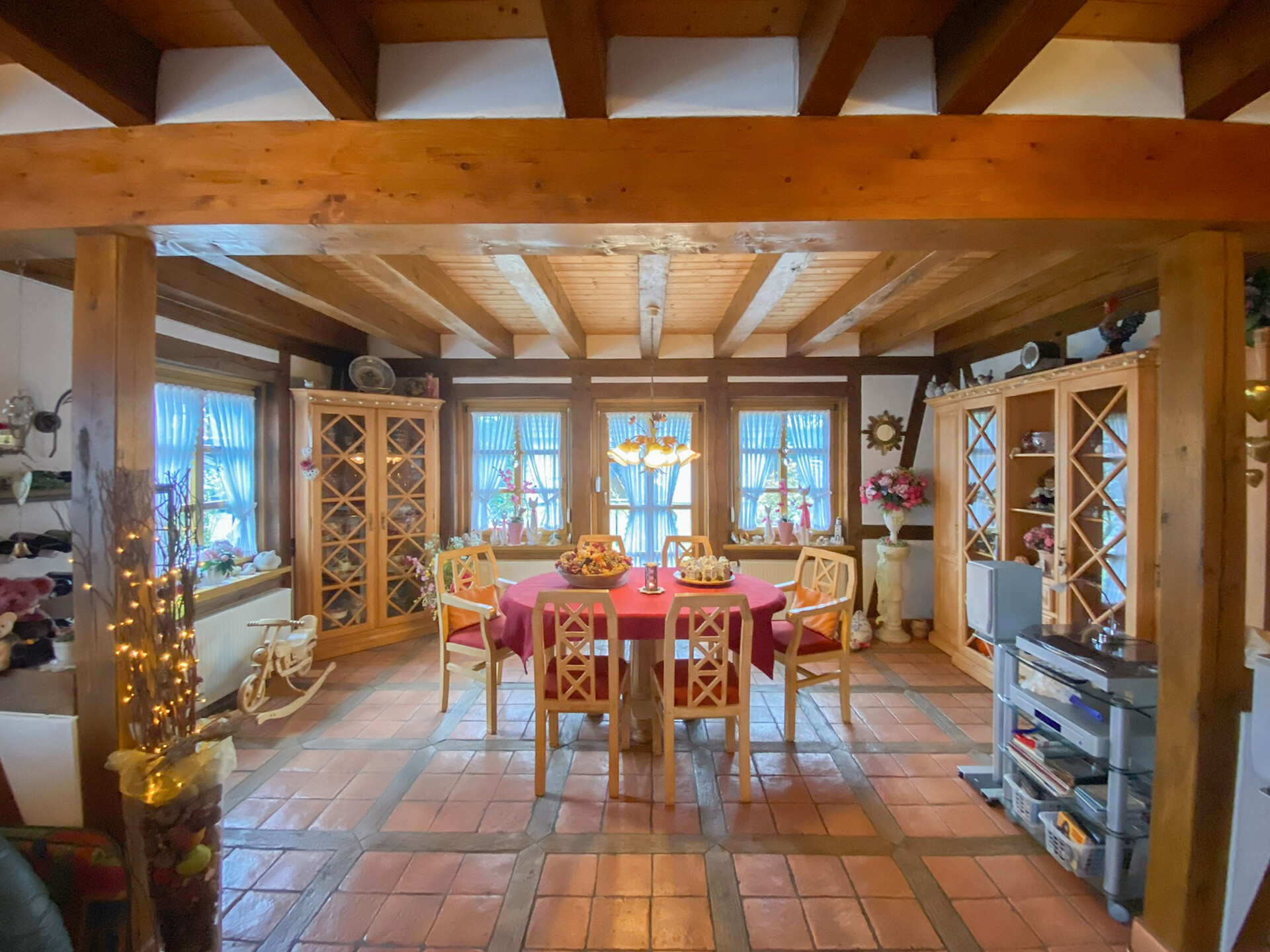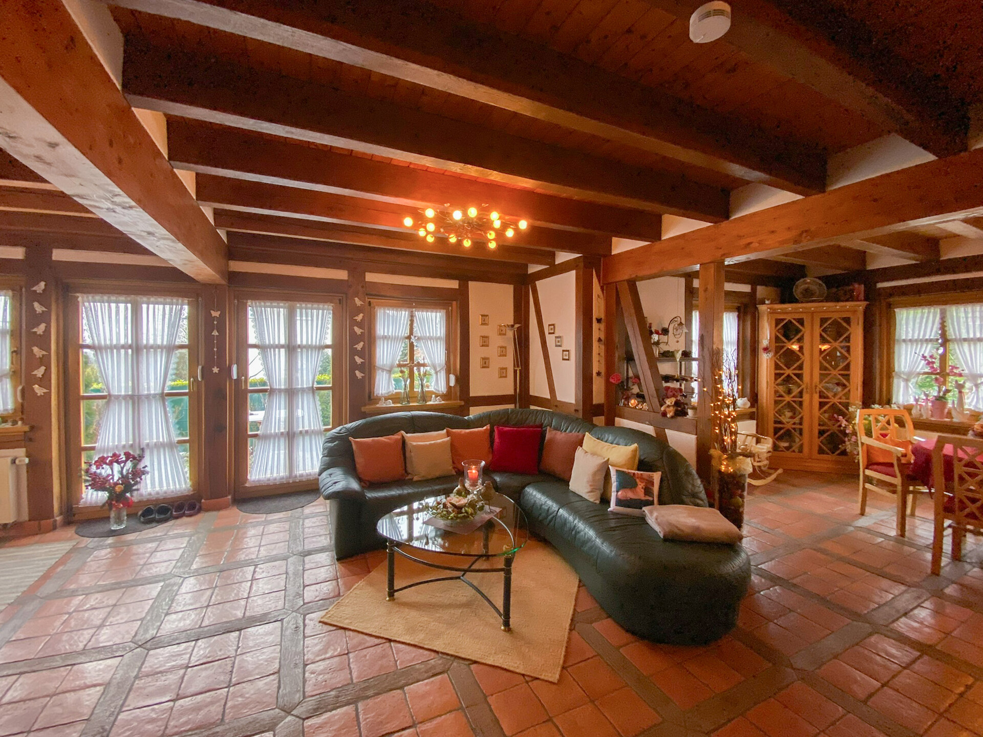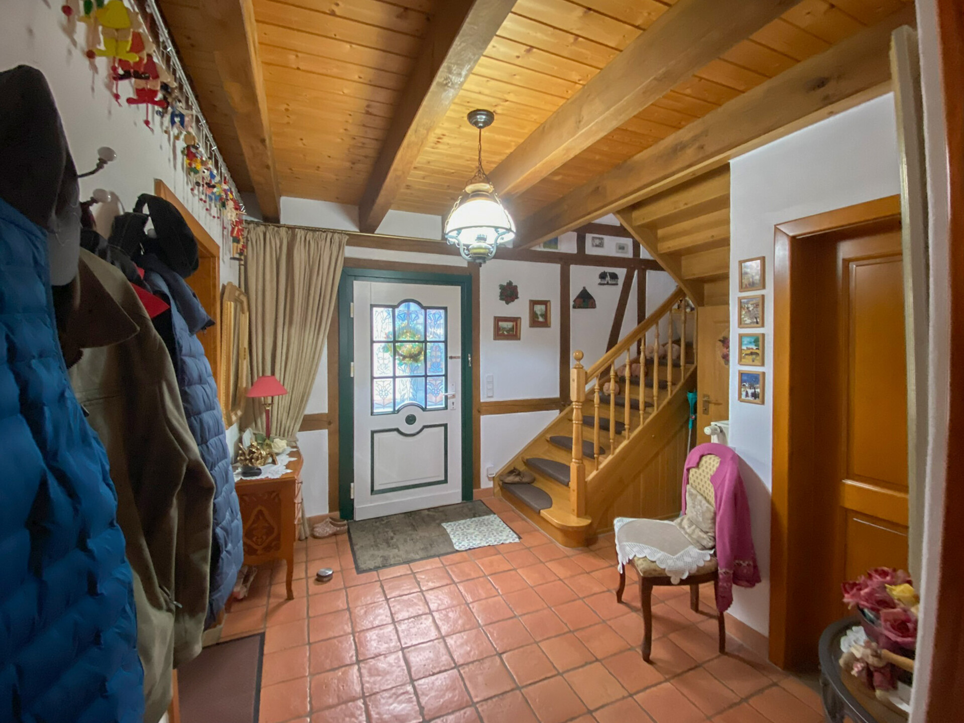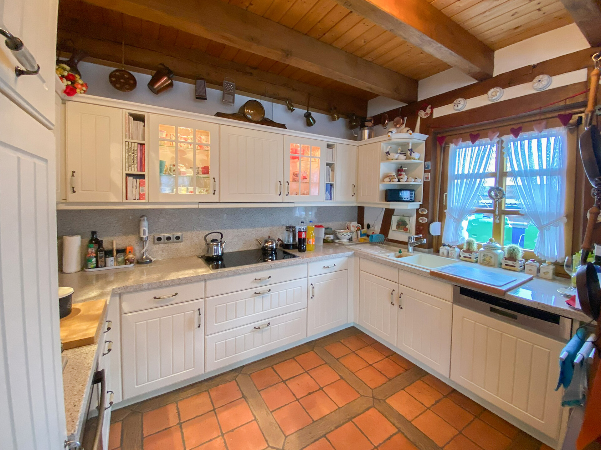 Im Erdgeschoss empfängt Sie eine einladende Diele, ein großzügiger Wohn- und Essbereich sowie die Küche, ausgestattet mit einer hochwertigen Einbauküche im Landhausstil, die auf Wunsch gegen Aufpreis übernommen werden kann. Der wunderschöne, terracottafarbene Natursteinboden im gesamten Erdgeschoss verleiht den Räumlichkeiten eine besondere Tiefe und einen exklusiven Charakter. Sichtbare Holzbalken prägen das Erscheinungsbild der Räume zusätzlich und setzen stilvolle Akzente. Ergänzt wird das Erdgeschoss durch einen HWR, eine kleine Abstellkammer unter der Treppe sowie ein Gäste-WC.