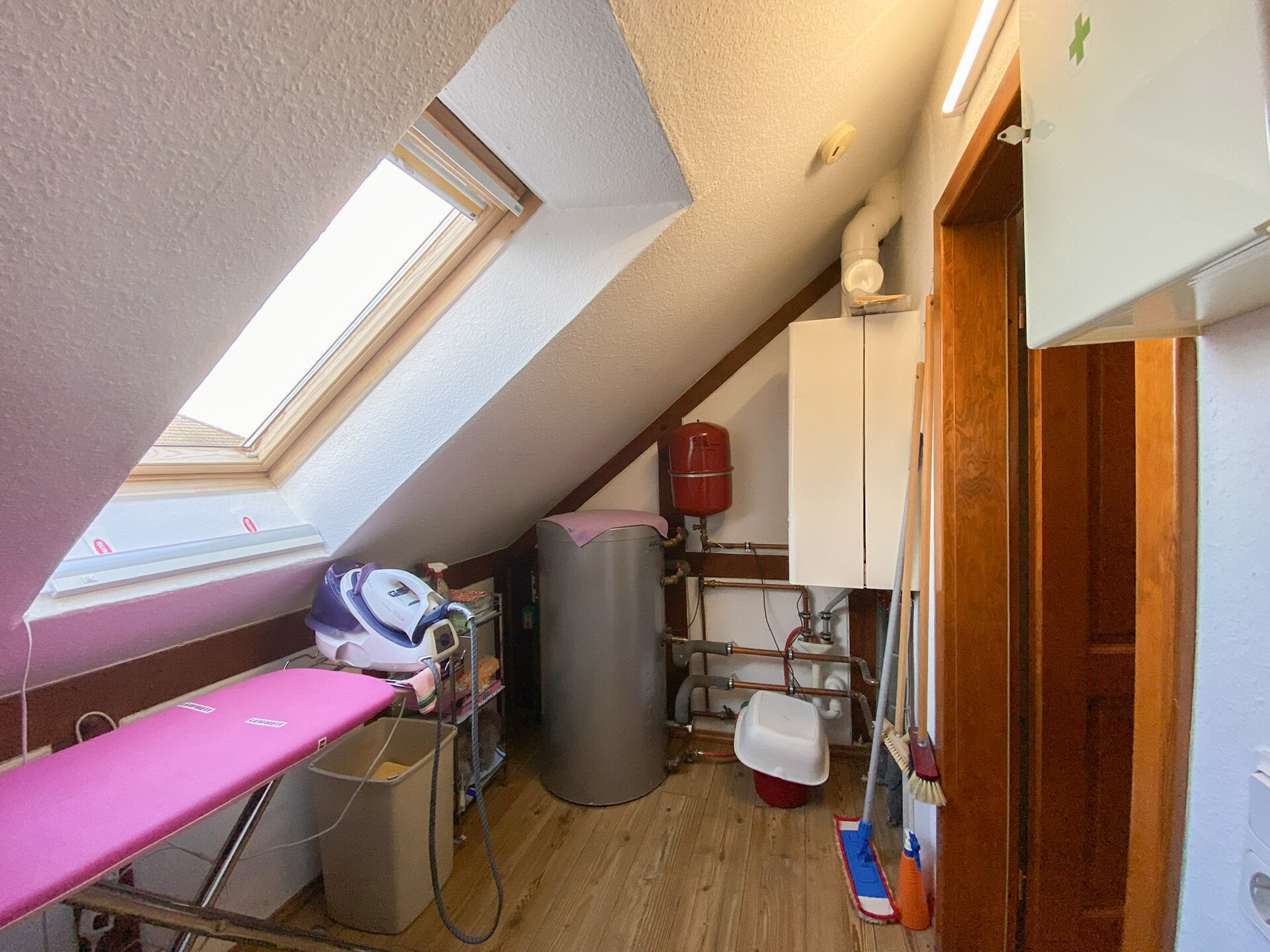 Im Obergeschoss befinden sich zwei Schlafzimmer, ein Badezimmer mit Fußbodenheizung sowie ein weiteres Gäste-WC. Ein zusätzlicher, kleiner Raum bietet sich hervorragend als Bügelzimmer oder individueller Arbeitsbereich an. Abgerundet wird das Obergeschoss durch einen ansprechenden Parkettboden.