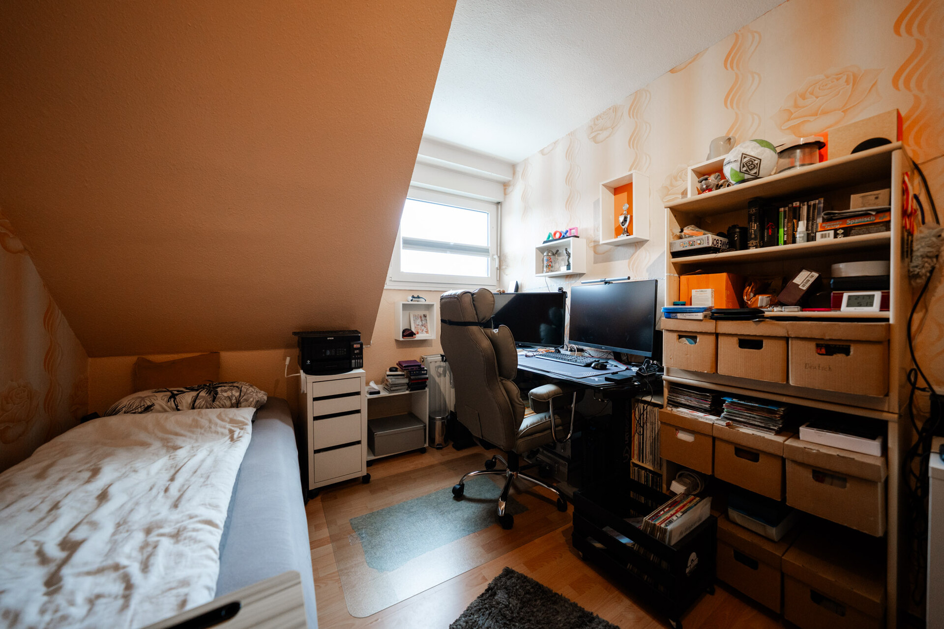 Im Obergeschoss entfaltet sich der private Bereich des Hauses. Das Schlafzimmer überzeugt durch seine ruhige, harmonische Atmosphäre. Das Tageslichtbad, 2011 modernisiert, ist mit Badewanne und Dusche praktisch und stilvoll ausgestattet. Ein weiteres Zimmer, über das Bad zugänglich, eignet sich ideal als Kinderzimmer, Gästezimmer oder Homeoffice. Das ausgebaute Dachgeschoss (nicht in der Wohnfläche enthalten) bietet zusätzlichen Raum für Hobbys, kreative Projekte oder einen persönlichen Rückzugsort.