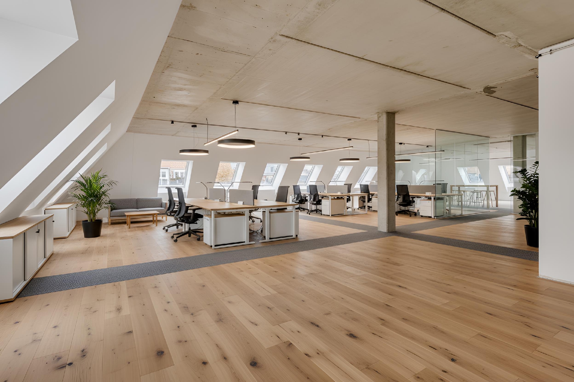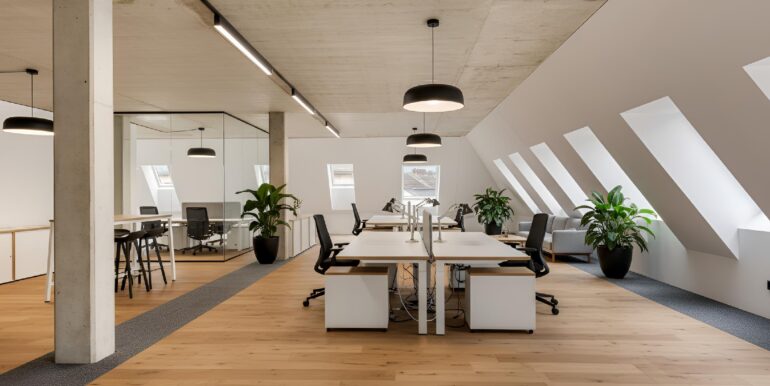 Die Mietfläche 5 zeichnet sich durch ihre außergewöhnliche Raumaufteilung aus. Die beiden Etagen sind durch eine interne Treppe verbunden, die eine nahtlose Verbindung zwischen den Ebenen schafft. Die großzügige Dachterrasse von ca. 100 m² bietet einen idealen Ort für Pausen, Meetings im Freien oder Events, und die Dachschrägen verleihen den Räumen einen besonderen Charakter. Diese Flexibilität ermöglicht es, die Fläche individuell auf die Anforderungen Ihres Unternehmens anzupassen und eine inspirierende Arbeitsumgebung zu schaffen. Die hochwertige Grundausstattung und die durchdachte Raumgestaltung bieten ideale Bedingungen für produktives Arbeiten. Der Mietpreis von 12,50 EUR/m² bezieht sich auf diese Grundausstattung, wobei auf Wunsch individuelle Planungen und spezielle Ausstattungswünsche berücksichtigt werden können.
