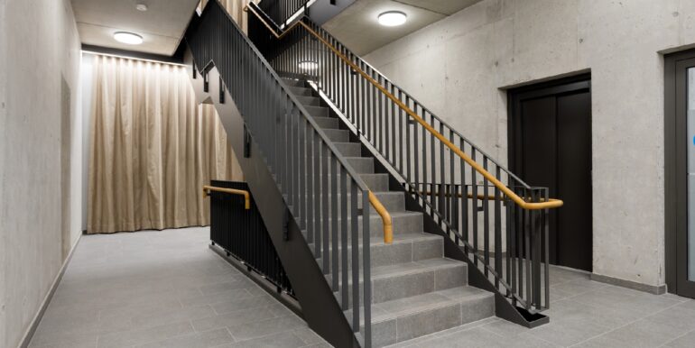 Die modernen sanitären Anlagen sind getrennt für Herren und Damen vorhanden, und barrierefreie WCs befinden sich auf jeder Etage, was den Komfort und die Zugänglichkeit für alle Mieter und Besucher sicherstellt. Diese umfassende Barrierefreiheit betont die moderne und inklusive Ausrichtung des gesamten Gebäudes.