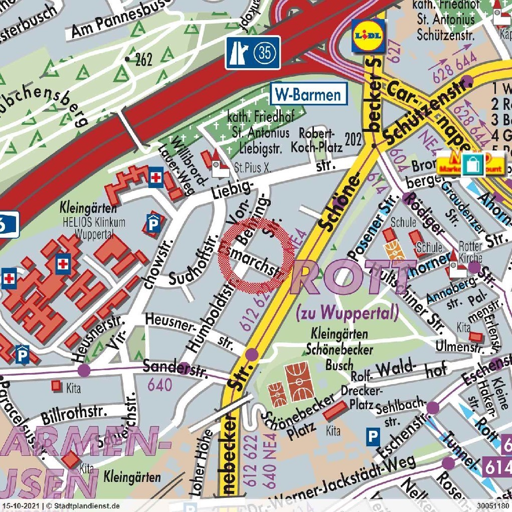 Wuppertal ist mit ca. 354.000 Einwohnern die größte Stadt des Bergischen Landes. Die Mehrfamilienhäuser liegen in einer Seitenstraße (30er Zone) im Stadtteil Barmen und wurden in geschlossener Bauweise errichtet. Die Einrichtungen des täglichen Bedarfs sind zum großen Teil in fußläufiger Entfernung zu erreichen. Mehrere Discounter (ALDI, NETTO), eine Bäckerei, Paketshop, Imbissbude befinden sich im nahen Umfeld. Ebenso eine Kindertagesstätte und eine Grundschule. Das Helios Klinikum befindet sich in unmittelbarer Entfernung. Für sportliche und freizeitliche Aktivitäten bieten sich die nahegelegene, ca. 22 km lange Nordbahntrasse und der Schönebecker Busch mit Kinderspielplatz an.