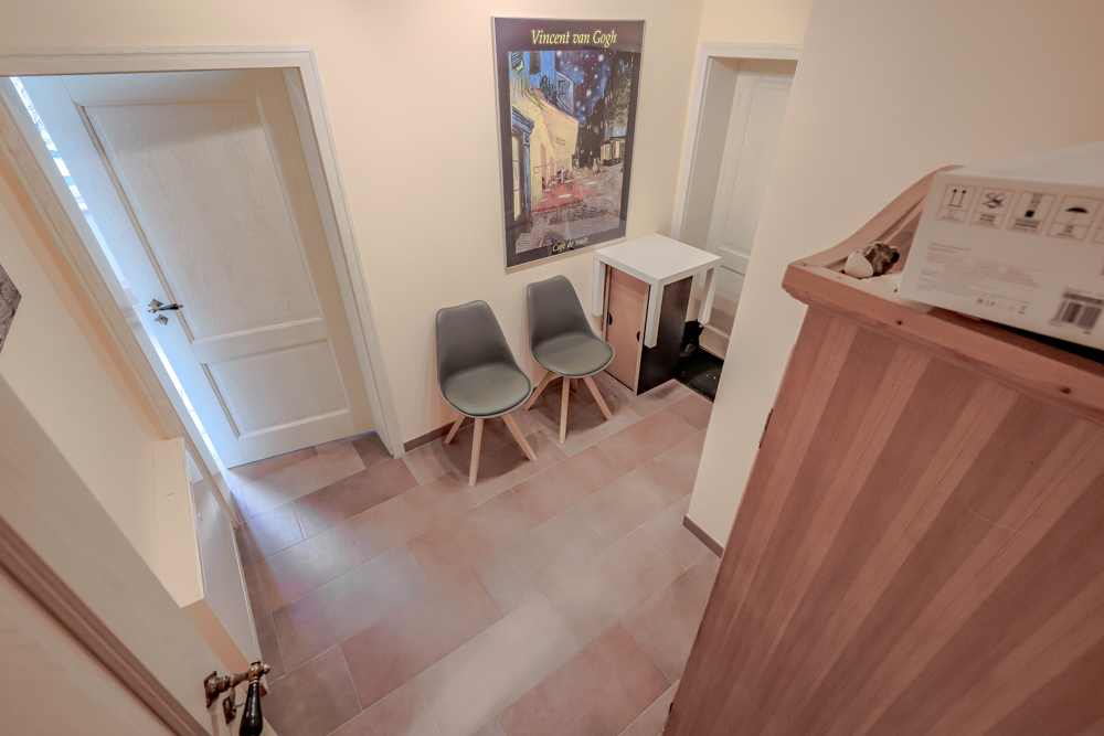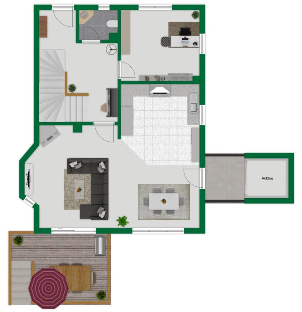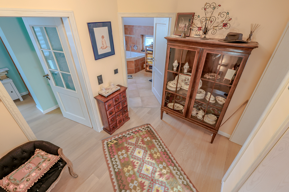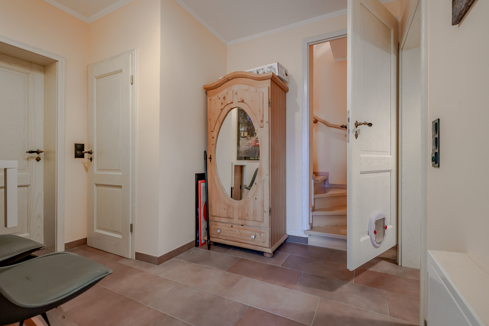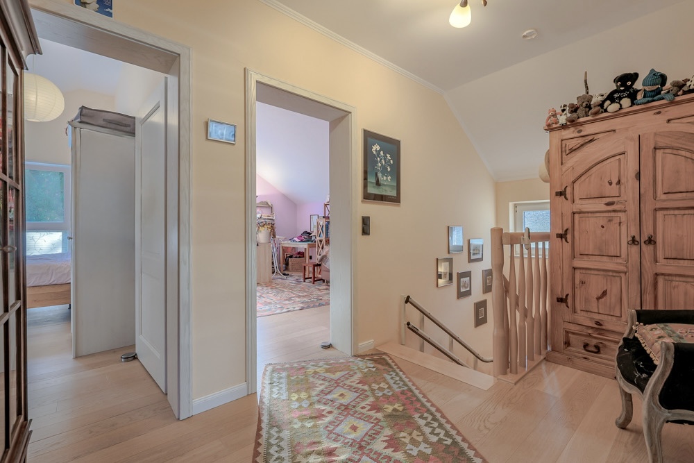 Anschlüsse für ein weiteres WC und eine zusätzliche Dusche sind hier bereits vorhanden. Alternativ gelangt man vom Erdgeschoss über eine Treppe mit integriertem Lift in das Obergeschoss.