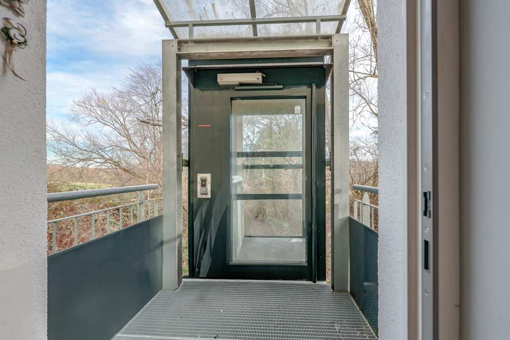 Vom Wohnbereich aus gelangt man auf die großzügige Terrasse mit Bangkirai-Belag, von der eine Treppe in den Garten mit Gartenhaus führt. Zusätzlich besteht vom Wohnzimmer aus die Möglichkeit, per außenliegendem Aufzug direkt in das Gartengeschoss zu gelangen.