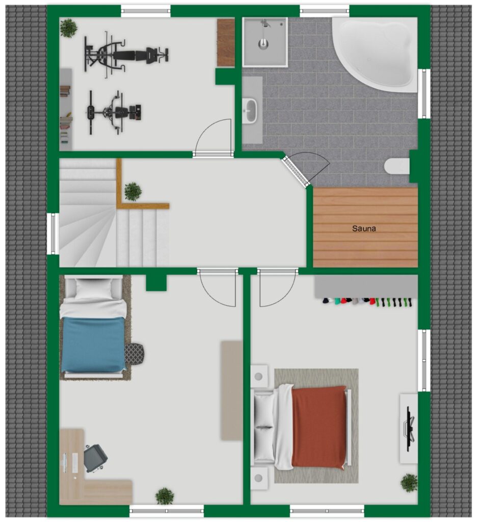 Im Obergeschoss stehen drei Zimmer sowie ein großzügiges Badezimmer zur Verfügung. Das Bad ist hochwertig ausgestattet und bietet eine integrierte Sauna, eine ebenerdige Dusche, eine Eckbadewanne mit Whirlpool-Funktion, einen Handtuchheizkörper sowie ein Fenster. Die durchdachte Planung ermöglicht komfortables Wohnen auch bei eingeschränkter Mobilität.