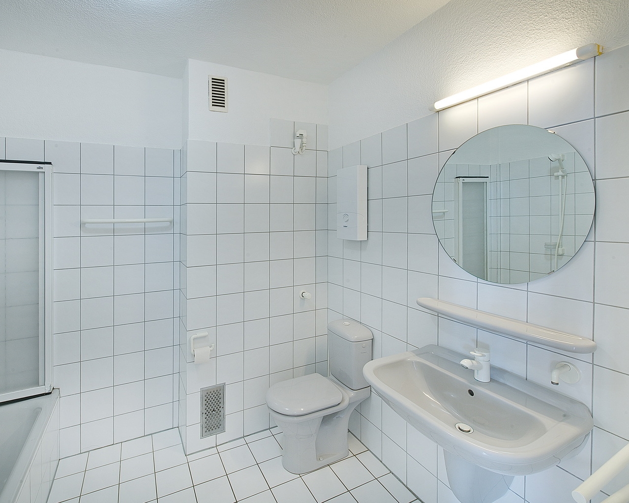 – Bad und Gäste-WC sind hell gefliest und verfügen über graue, bzw. weiße Sanitärkeramik