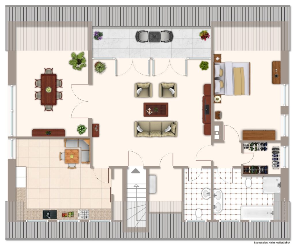 Die Dachgeschosswohnung wurde vor einigen Jahren komplett neu erstellt. Es entstand auf ca. 130 m² Wohnfläche eine 3-Zimmer-Wohnung mit einem Schlafzimmer, einem großen Wohnzimmer mit süd-westlich ausgerichtetem Balkon sowie einem Esszimmer. Die Küche ist vom Wohnzimmer aus begehbar, ebenfalls großzügig dimensioniert und mit einer modernen, weißen Einbauküche ausgestattet. Das Bad wurde weiß gefliest, verfügt über Wanne und Dusche und – wie auch das Gäste-WC – über ein Fenster.