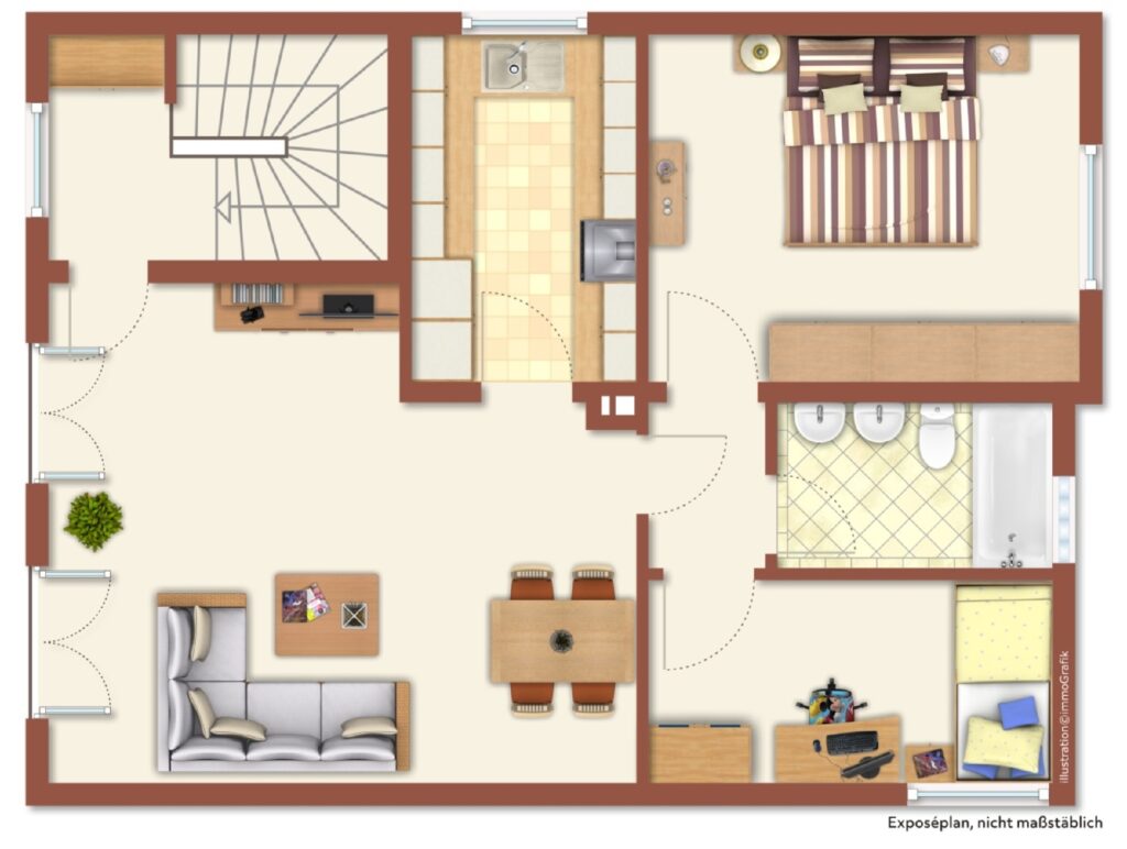 Im Erdgeschoss erwartet Sie eine großzügige Wohnküche, die zum gemeinsamen Kochen und Verweilen einlädt. Der lichtdurchflutete Essbereich geht nahtlos in das einladende Wohnzimmer über, das mit einem gemütlichen Kamin ausgestattet ist und direkten Zugang zur Terrasse bietet perfekt für entspannte Sommerabende im Freien. Hier finden Sie auch zwei behagliche Schlafzimmer, ein innenliegendes Badezimmer sowie ein praktisches Gäste-WC.