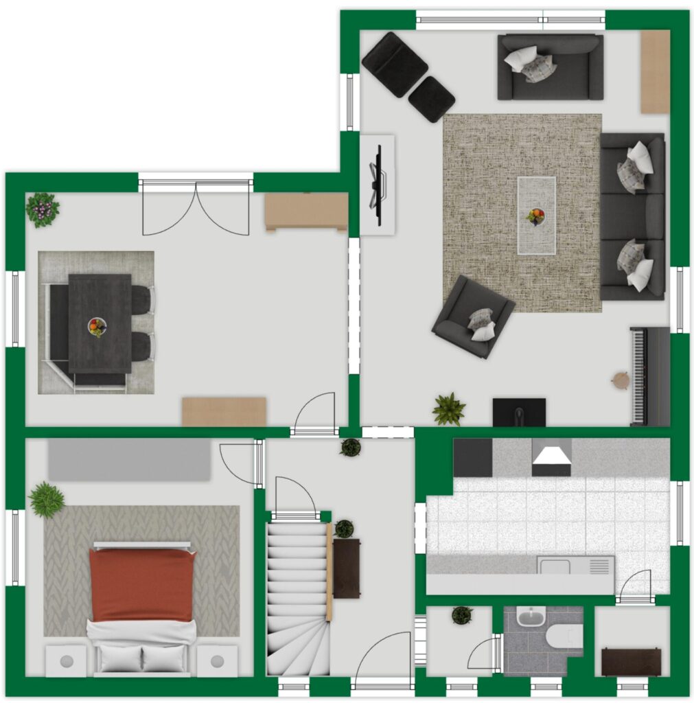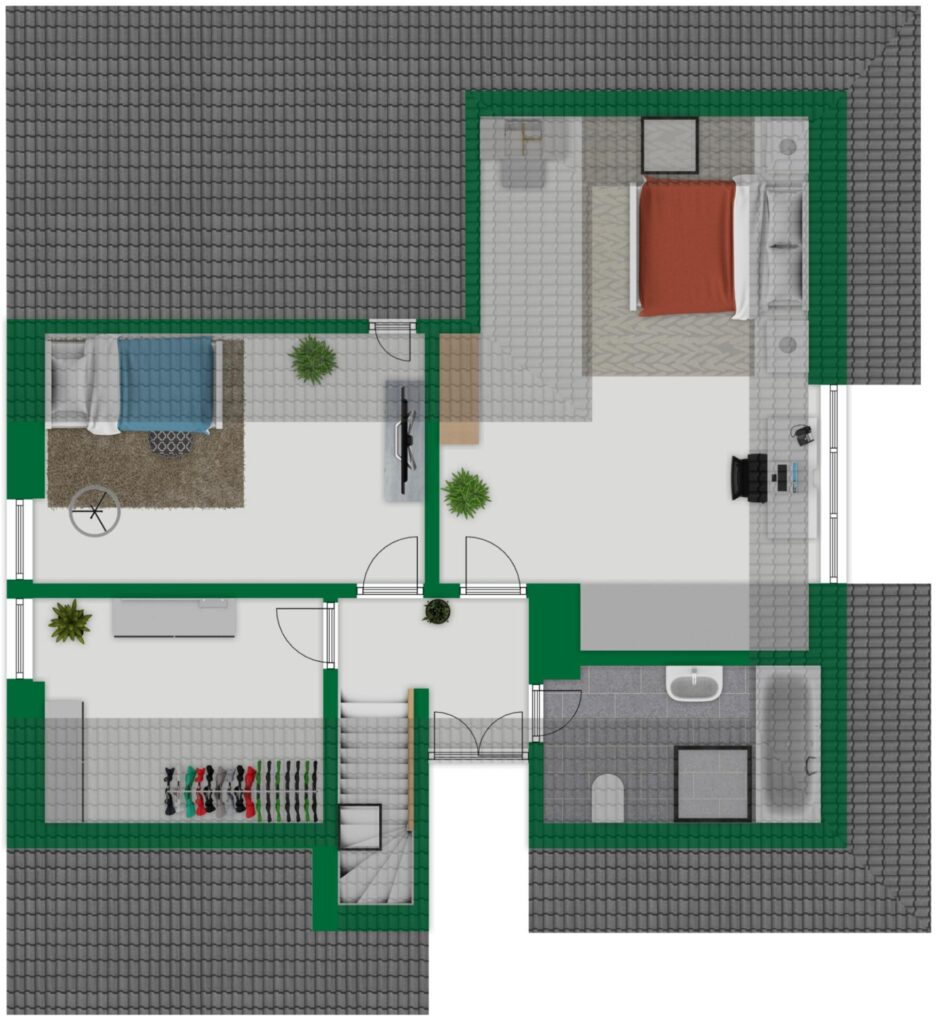 Die Raumaufteilung bietet vielfältige Nutzungsmöglichkeiten. Im Erdgeschoss befinden sich ein großzügiger Wohnbereich mit Kamin, die charmante Küche sowie zwei weitere Zimmer und ein Gäste-WC. Das Dachgeschoss ist voll ausgebaut und bietet zusätzlichen Platz in Form von drei Zimmern und einem Tageslichtbad. Im Keller ist ein praktisches Büro integriert. Zudem gibt es dort ein weiteres Bad, die Waschküche und Abstellräume. Direkt neben dem Büro befindet sich eine Kelleraußentüre.