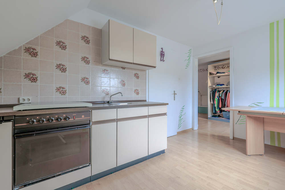 Im Obergeschoss befinden sich drei gut geschnittene Zimmer sowie ein Badezimmer. Praktisch: Einer der Räume verfügt über Küchenanschlüsse, wodurch sich hier die Möglichkeit eröffnet, das Haus auch in zwei Wohneinheiten aufzuteilen – ideal für Mehrgenerationenwohnen oder eine Teilvermietung. Der Balkon bietet einen schönen Blick in die Umgebung und unterstreicht das naturnahe Wohngefühl.