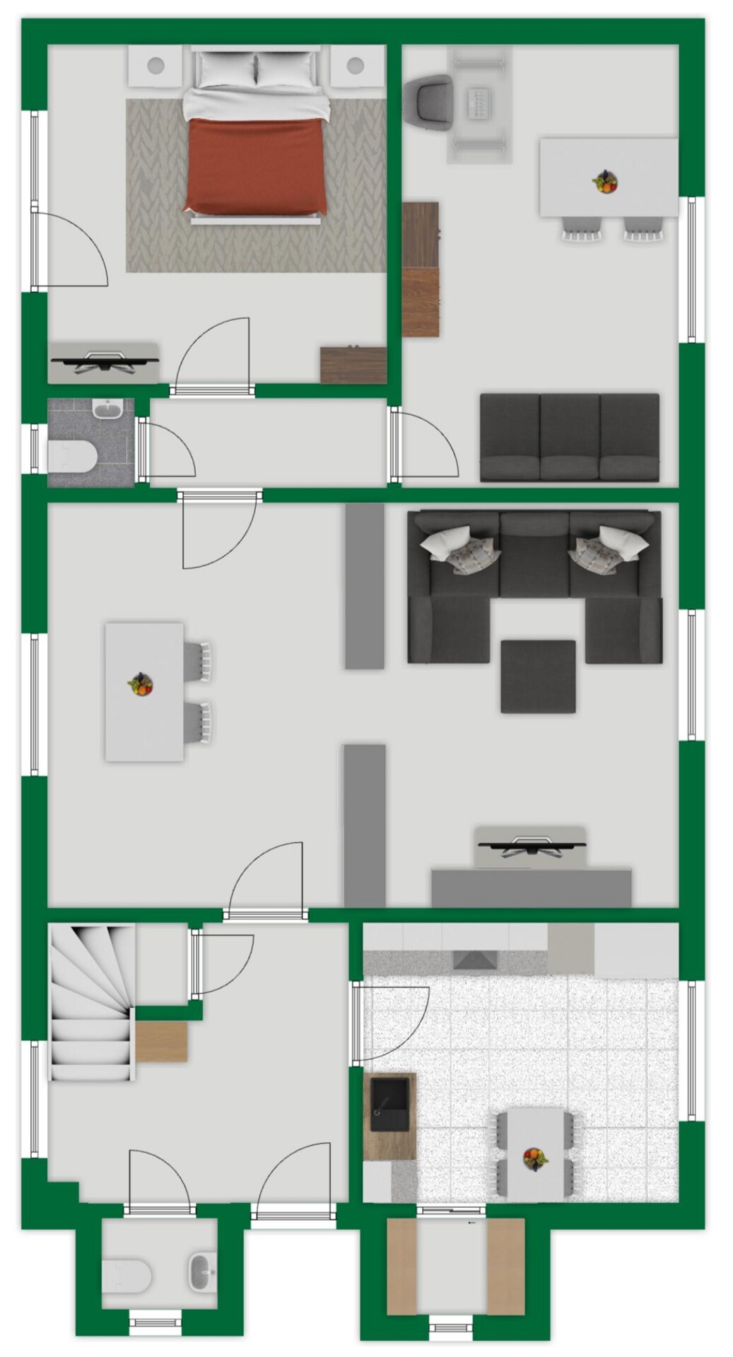 Das Haus erstreckt sich über drei Ebenen und überzeugt durch seinen funktionalen Grundriss. Im Erdgeschoss befindet sich ein heller Wohn- und Essbereich mit Zugang zur Terrasse und in den weitläufigen Garten. Die angrenzende Küche ist großzügig geschnitten und bietet Platz für eine moderne Einbauküche. Zusätzlich stehen auf dieser Ebene zwei Schlafzimmer und zwei Gäste-WCs zur Verfügung.