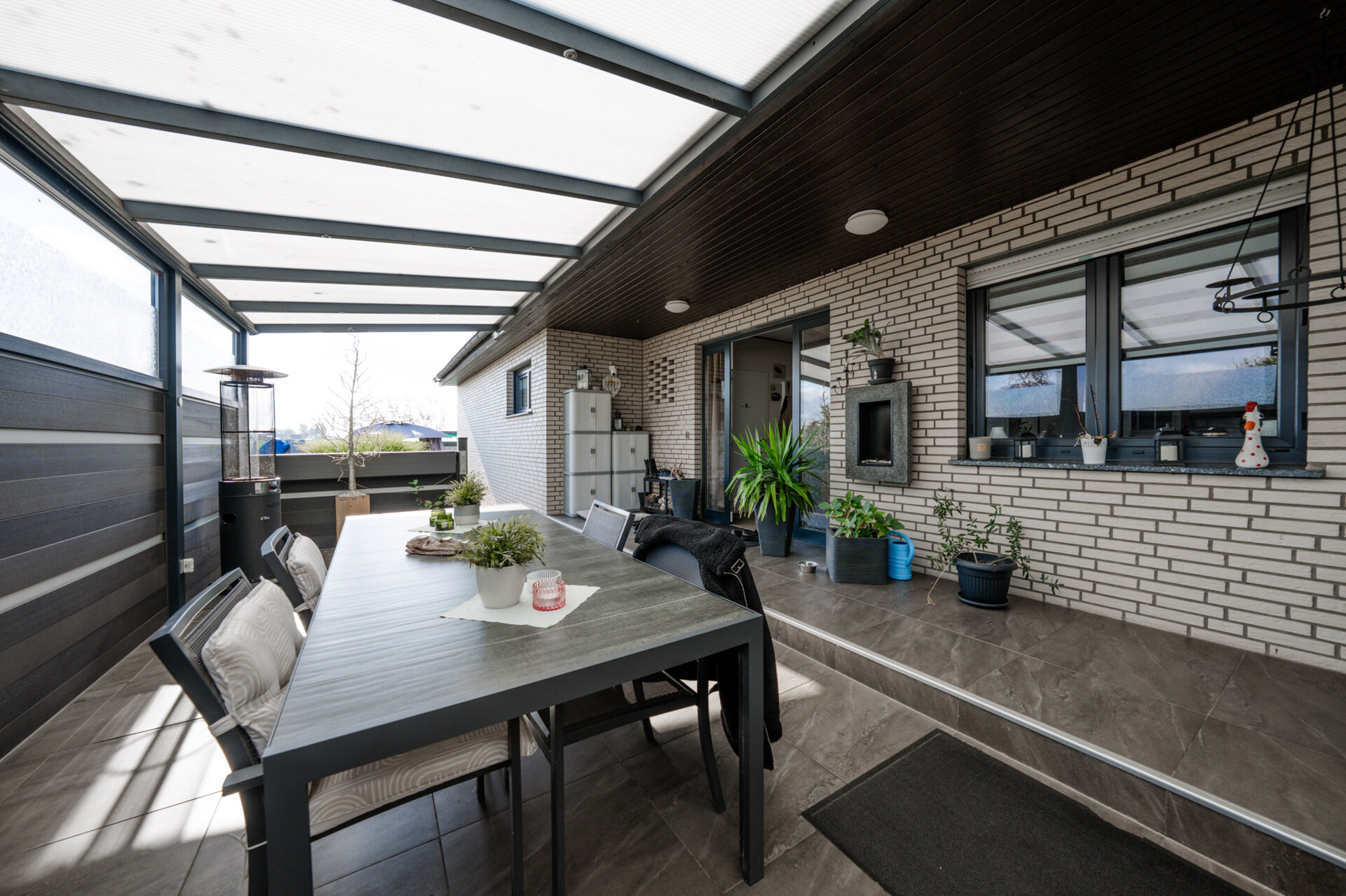 – Überdachte Terrasse, die den Wohnraum nach draußen erweitert und den Garten elegant