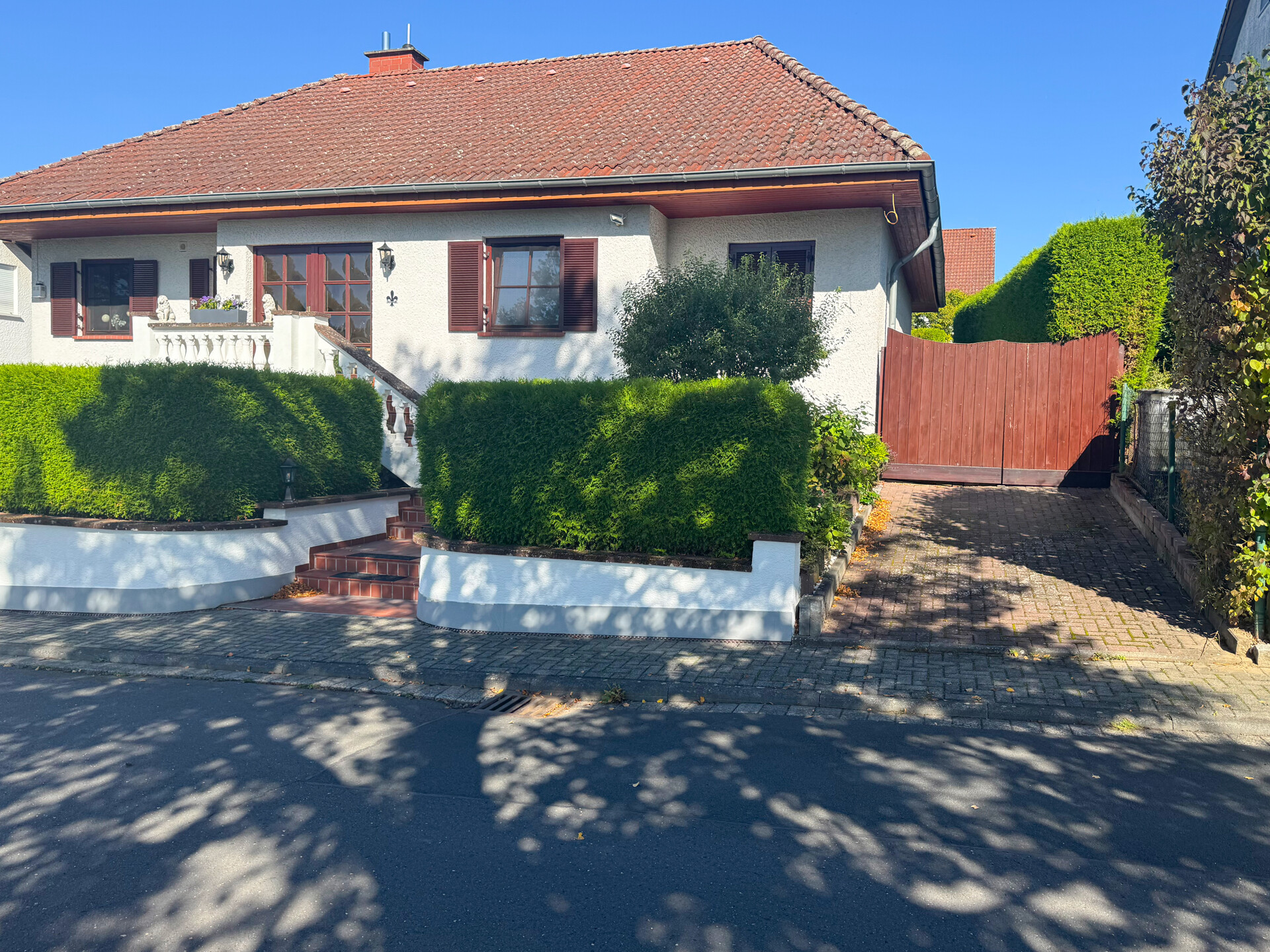 Dieses massive Einfamilienhaus wurde ca. 1990 erbaut und erstreckt sich über eine Etage, wodurch Wohnen auf einer Ebene ermöglicht wird. Die Wohnfläche von ca. 142 m² umfasst ein klimatisiertes Schlafzimmer mit angrenzender Ankleide, ein Büro/Kind, ein Badezimmer sowie Gäste. Der begehbare Kleiderschrank sorgt für Stauraum und Komfort. Die Einbauküche lädt zum Kochen und Verweilen ein. Ergänzend sorgt ein luxuriöser Wellnessbereich mit Sauna und Pool für Entspannung. Im EG befinden sich zudem der Wohnbereich und das Esszimmer mit Zugang zum Garten, sodass Sie nahtlos Innen- und Außenwohnen genießen. Das ca. 592 m² große Grundstück bietet eine tolle Fernsicht. Der gepflegte Garten mit Pool eignet sich hervorragend für gesellige Abende oder ruhige Momente im Freien. Das Haus ist unterkellert und bietet vielseitige Nutzungsmöglichkeiten-neben dem Hobbyraum mit Sauna und Duschbad mit WC stehen zusätzliche Stauraumflächen und Weiteres zur individuellen Nutzung bereit. Das DG bietet zudem Ausbaupotenzial: Raumhöhe und Raumgestaltungsmöglichkeiten ermöglichen eine flexible Erweiterung bei Bedarf, z. B. als zusätzlicher Wohn- oder Arbeitsbereich, Gästezimmer oder Mansardenzugang. Der Hofbereich mit großer Garage sorgt für ausreichend Stellfläche für Ihre PKWs.
