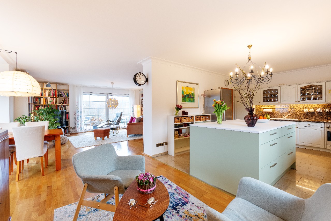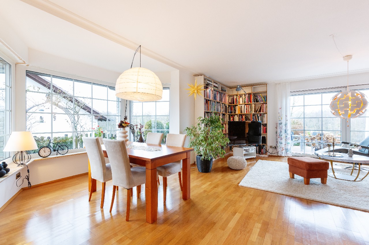 Der offen gestaltete Wohnbereich bietet direkten Zugang zum Wintergarten sowie zur großzügigen Terrasse und schafft eine harmonische Verbindung zwischen Innen- und Außenraum.