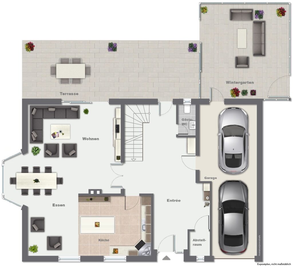 Eine großzügige Doppelgarage bietet Platz für zwei Fahrzeuge sowie zusätzlichen Stauraum. Neben dem klassischen elektrisch betriebenen Garagentor verfügt die Garage auch über zwei Verbindungstüren, die einen geschützten und direkten Zugang in das Einfamilienhaus und den Wintergarten ermöglichen.