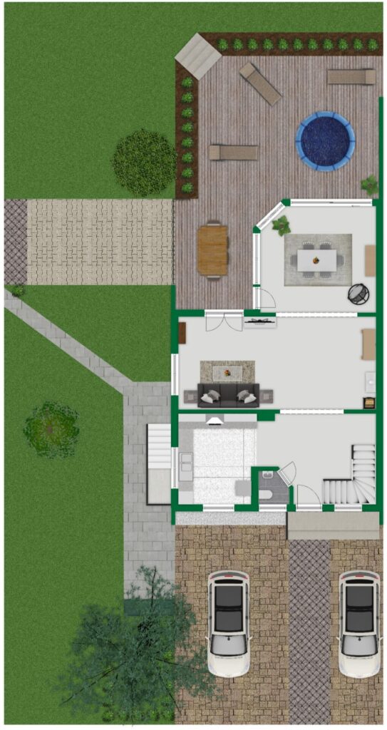 Die Raumaufteilung ist funktional und familiengerecht gestaltet. Im Erdgeschoss befinden sich das helle Wohnzimmer, die moderne Küche sowie der großzügige Wintergarten mit Zugang zur Terrasse. Ein Gäste-WC rundet den Grundriss auf dieser Etage ab.