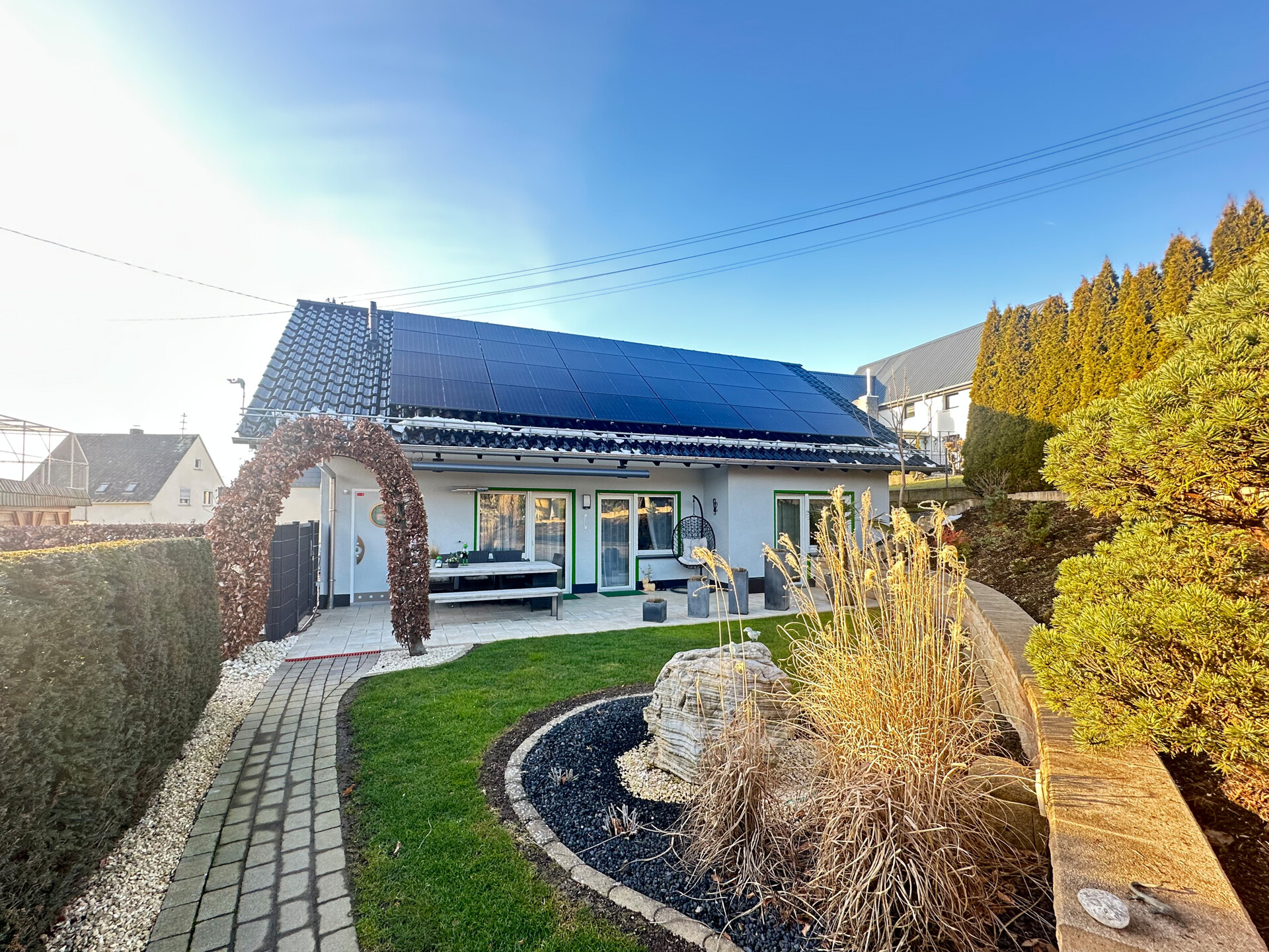 Hochwertige Details wie Granit an der Eingangstreppe und den Fensterbänken unterstreichen die Exklusivität der Immobilie. Die zwei kugelsicheren Eingangstüren sorgen für höchste Sicherheit. Ergänzt wird das Angebot durch einen Bruchsteinkeller, eine Garage, vier Stellplätze und eine moderne Photovoltaikanlage.