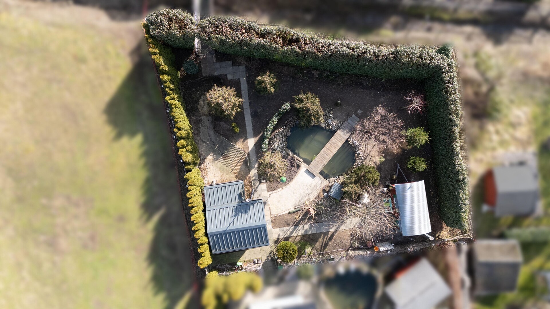 Die Immobilie verfügt über zwei Badezimmer (2012 und 2016), eine Terrasse mit Markise, Windmelder und Infrarot-Heizstrahlern sowie eine Klimaanlage im Dachgeschoss des Altbaus. Ein Mähroboter sorgt für die Pflege der Außenanlagen. Im Garten befindet sich ein nützliches Gartenhaus. Die Hoffläche ist 2025 mit schwarzen Klinkersteinen gepflastert und verfügt über einen Hofablauf. Zur Sicherheit tragen kugelsichere Eingangstüren (2012) sowie eine professionelle Videoüberwachung (2018) bei. Zusätzlich grenzt ein Naturgrundstück an, auf dem sich eine massive, gedämmte Holzhütte und ein Bauwagen mit Werkstattofen und Edelstahl-Kamin befinden. Ergänzt wird das Areal durch einen WLAN-Verstärker am Mast, einen Naturteich mit Holzbrücke mit stabilem Metalluntergestell.