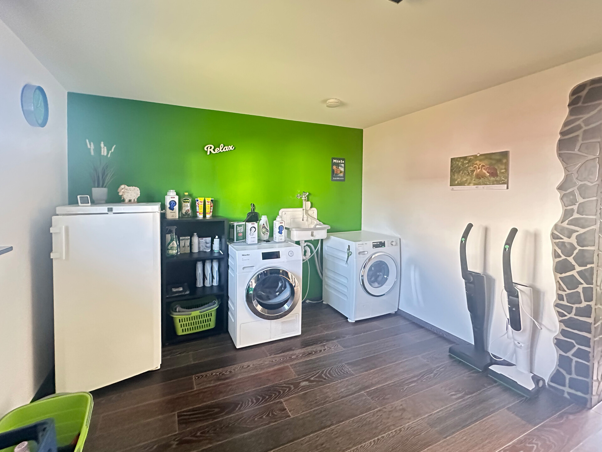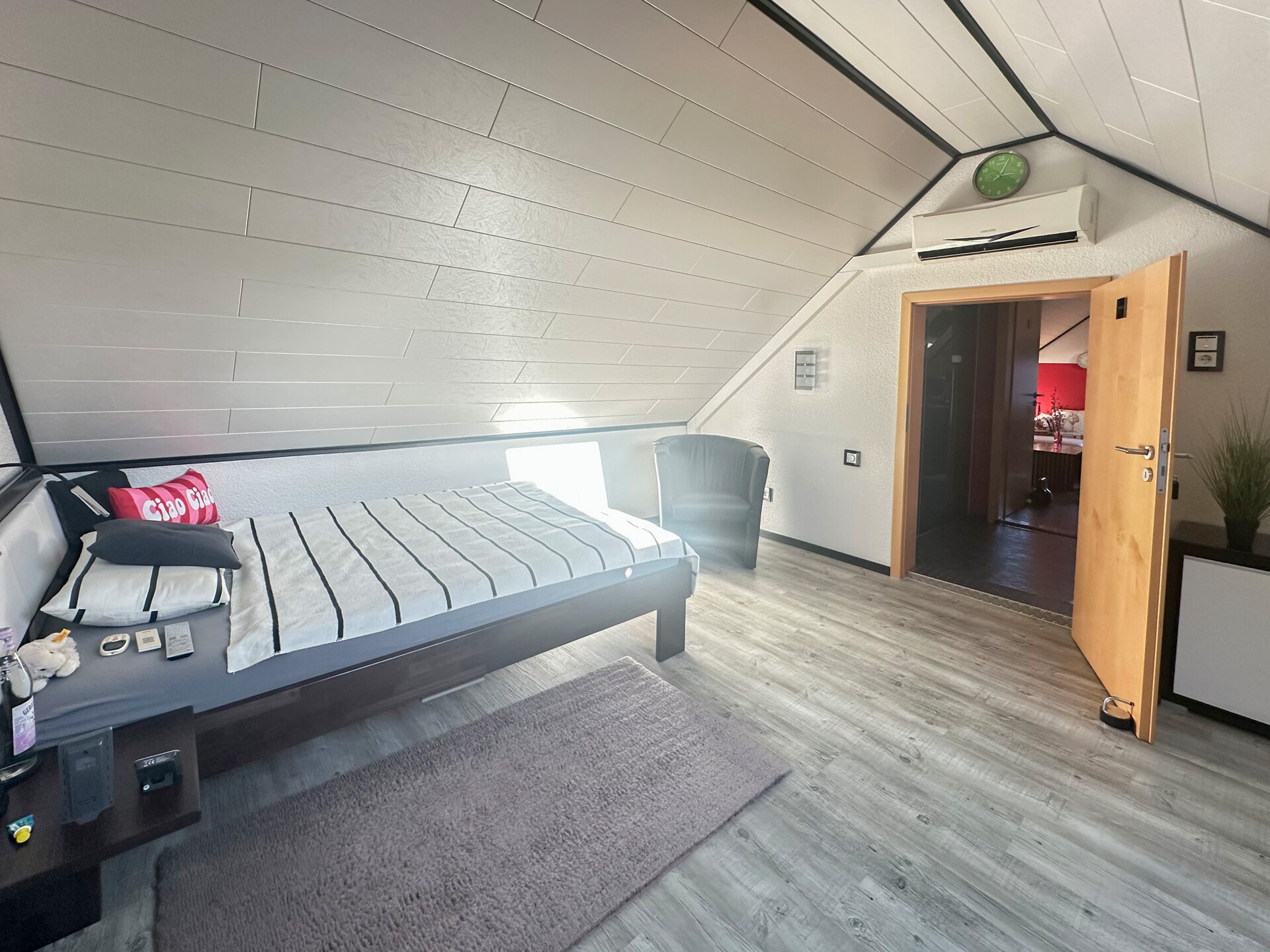 Im Obergeschoss befinden sich weitere Wohnräume, eine Küche, ein Badezimmer sowie eine Waschküche, die bei Bedarf auch problemlos als zusätzliches Schlafzimmer genutzt werden kann. Das Dachgeschoss bietet zusätzlich zwei nützliche Räume. Besonders hervorzuheben sind hier der maßgefertigte Einbauschrank mit Sicherheitsverriegelung sowie die individuell angefertigte Treppe ins Dachgeschoss.