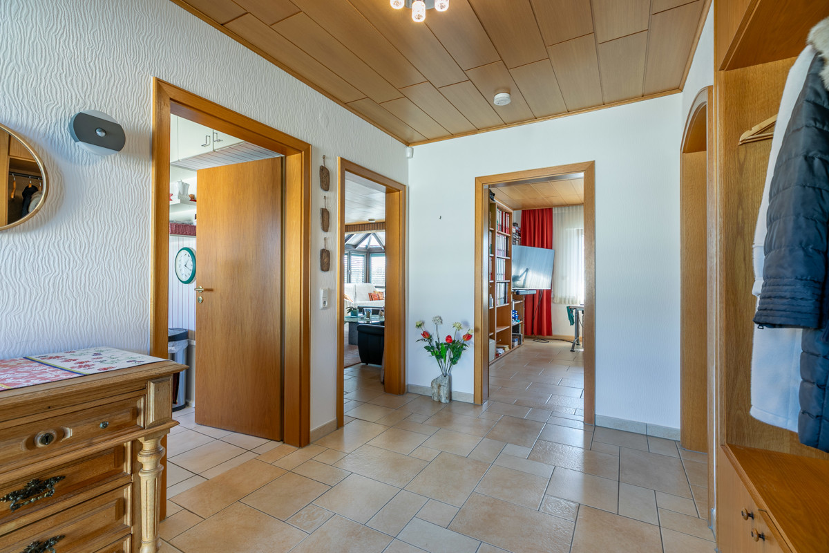 Lichtdurchflutete Architektur empfängt Sie im Erdgeschoss schon beim Betreten des Hauses. Der großzügige Wohn-/Essbereich mit angrenzender Küche wird Sie sofort begeistern. Ein herrlicher Wintergarten beschert Ihnen einen wunderbaren Ausblick in die Natur zu jeder Jahreszeit. Auf dem großen Südbalkon genießen Sie gemütliche Stunden, oder Sie nutzen direkt die praktische Treppe in den herrlichen Garten. Zurück im Erdgeschoss bieten Ihnen zwei Schlafzimmer mit Klimaanlage angenehme Rückzugsmöglichkeiten. Ein großzügiges Vollbad und ein separates WC schaffen auf dieser Etage Platz für alle bei der morgendlichen Routine. Im Untergeschoss befinden sich nochmals Ausweichmöglichkeiten in Form von Dusche und separatem WC. Hier gibt es außerdem zwei zu Wohnzwecken ausgebaute Räume, die perfekt für Gäste, Büro oder Hobby zu nutzen sind. Ein besonderes Highlight dieser Einheit stellt der integrierte Saunabereich dar. Der direkte Zugang in den Garten garantiert Entspannung pur! Hier hat ein Gartenarchitekt ein kleines Paradies geschaffen, das mit seinen verschlungenen Wegen und Sitzplätzen zum Wandeln, Verweilen und Staunen einlädt.