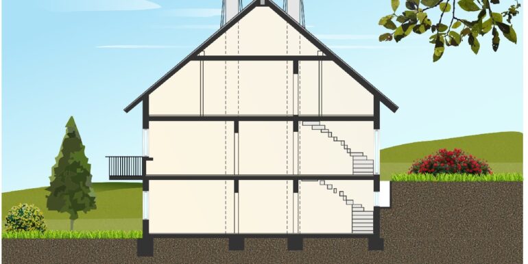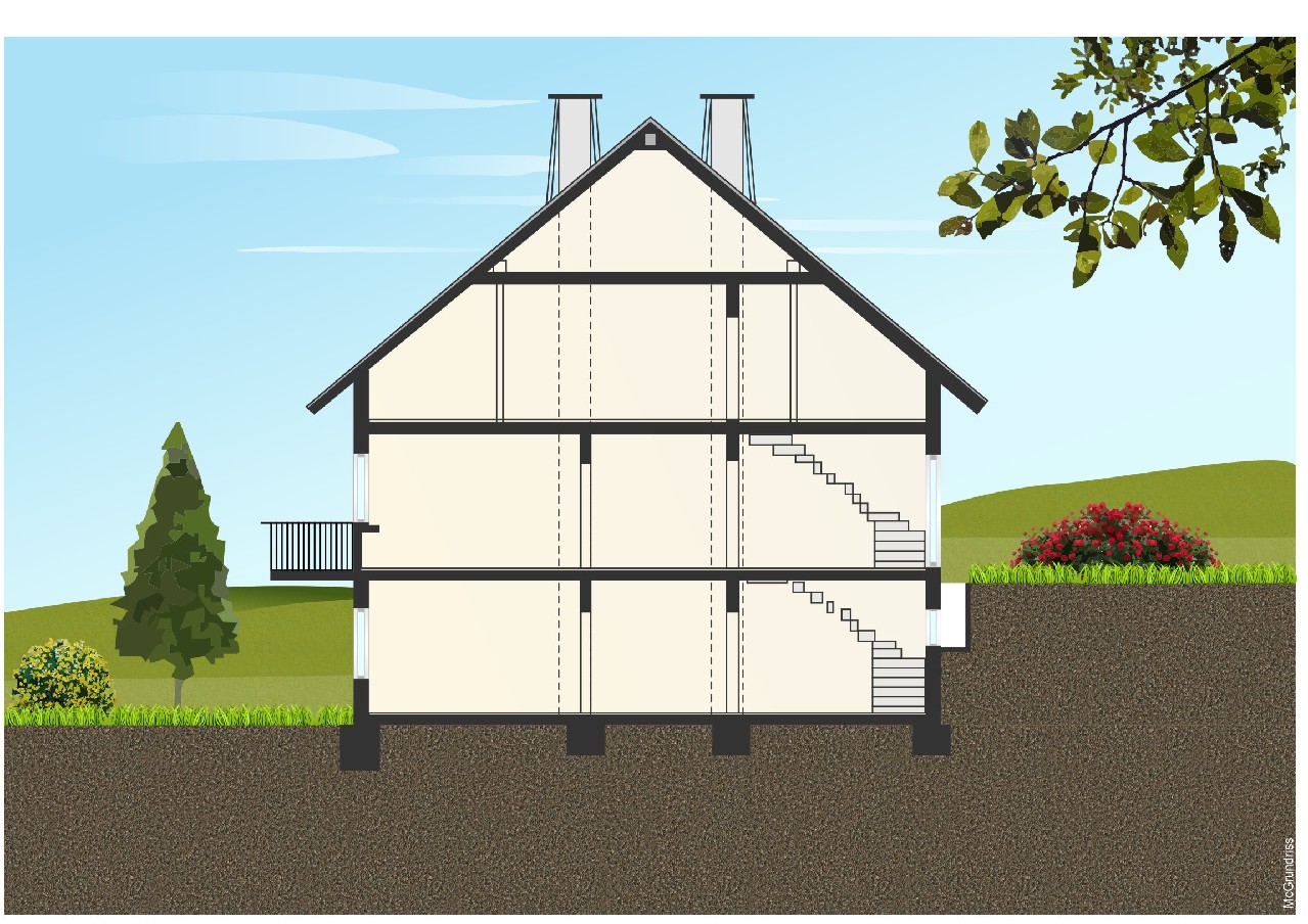 Souterrain ca. 80 m² Wohnfläche: 2 Zimmer, Kochen-/Essen, Diele, Bad/WC und Terrasse. Erdgeschoss ca. 100 m² Wohnfläche: 5 Zimmer, Küche, Diele, Bad/WC, Gäste-WC und Balkon. Dachgeschoss je ca. 45 m² Wohnfläche: 2 Wohnungen mit je 2 Zimmer, Küche, Diele, Bad/WC und Balkon. Garage.