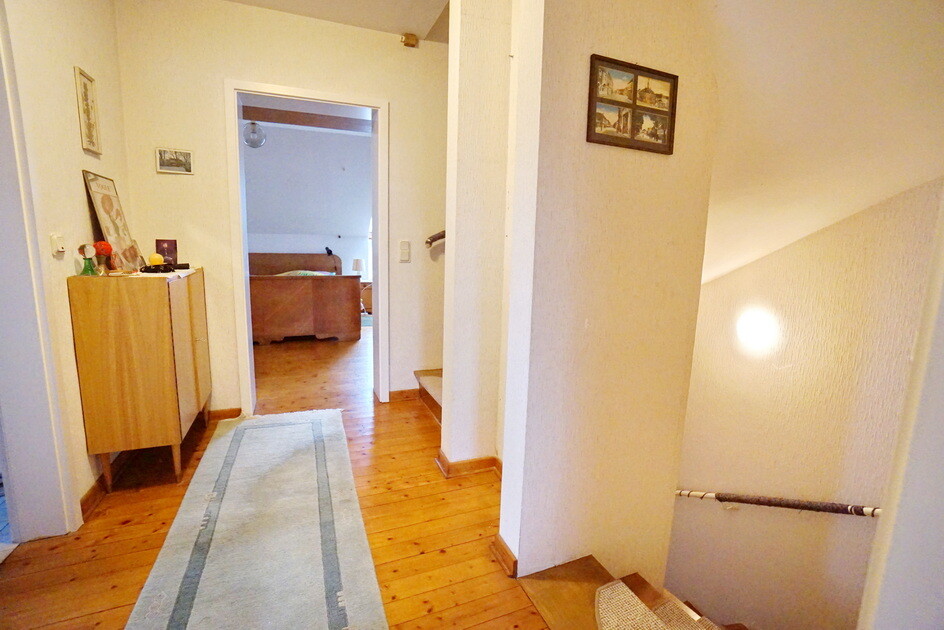 Im Obergeschoss sind 2 Schlafräume und das Bad mit Wanne und Dusche untergebracht. Das Dachgeschoss ist voll ausgebaut, hier finden Sie mit zwei Dachgauben ein ca. 26 m² großes Studio mit viel Lichteinfall, das vielseitig genutzt werden kann. Der durchgehende Holzboden in allen Wohnbereichen trägt zur gemütlichen Wohnatmosphäre bei, während das Badezimmer mit pflegeleichten Fliesen ausgestattet ist.