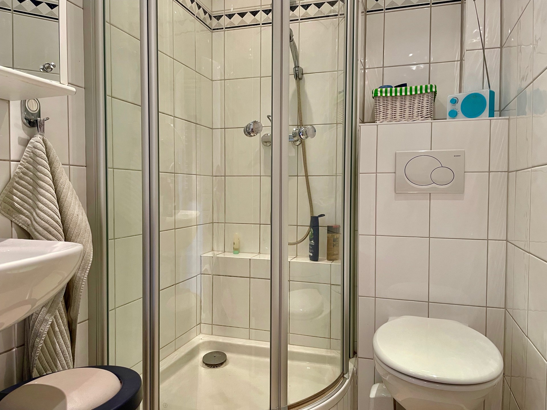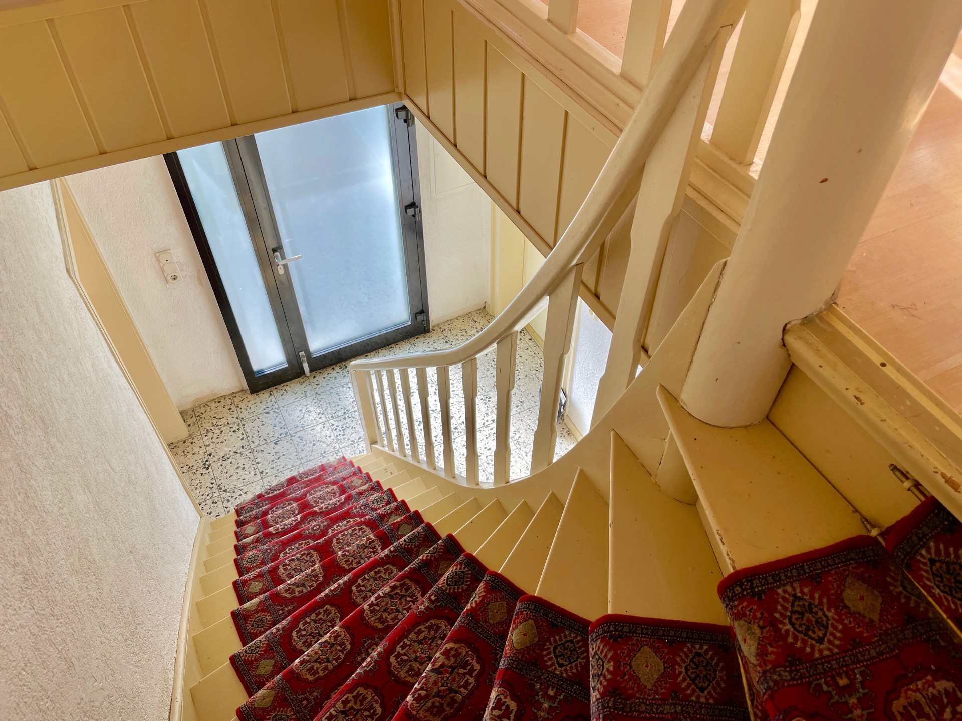 Von der Straße gelangt man über mehrere Stufen zum Hauseingang und betritt das originalgetreu erhaltene Treppenhaus. Von hier aus gelangt man in die ca. 80 m² große, renovierungsbedürftige Erdgeschosswohnung. Diese verfügt über eine Küche, ein Wohnzimmer und zwei Schlafzimmer. Die Räume sind wie auch das kleine Badezimmer durch einen Flur erschlossen. Im hinteren Teil dieser Etage befinden sich Heizungsraum und Werkstatt. Das Obergeschoss wurde 2013 neu renoviert und zu einer Wohnung mit ca. 96 m² und offenem Raumkonzept umgestaltet. Im Dachgeschoss befinden sich drei Mansardenzimmern und ein kleines Bad sowie Speicherplatz.