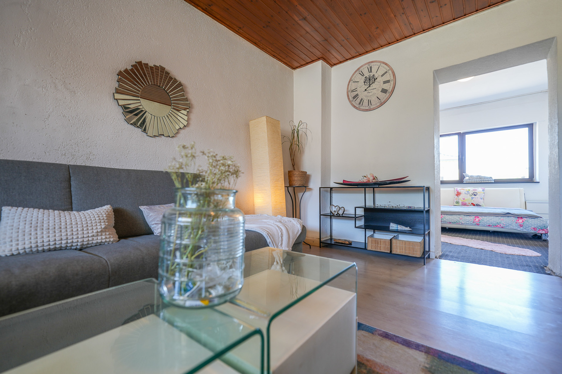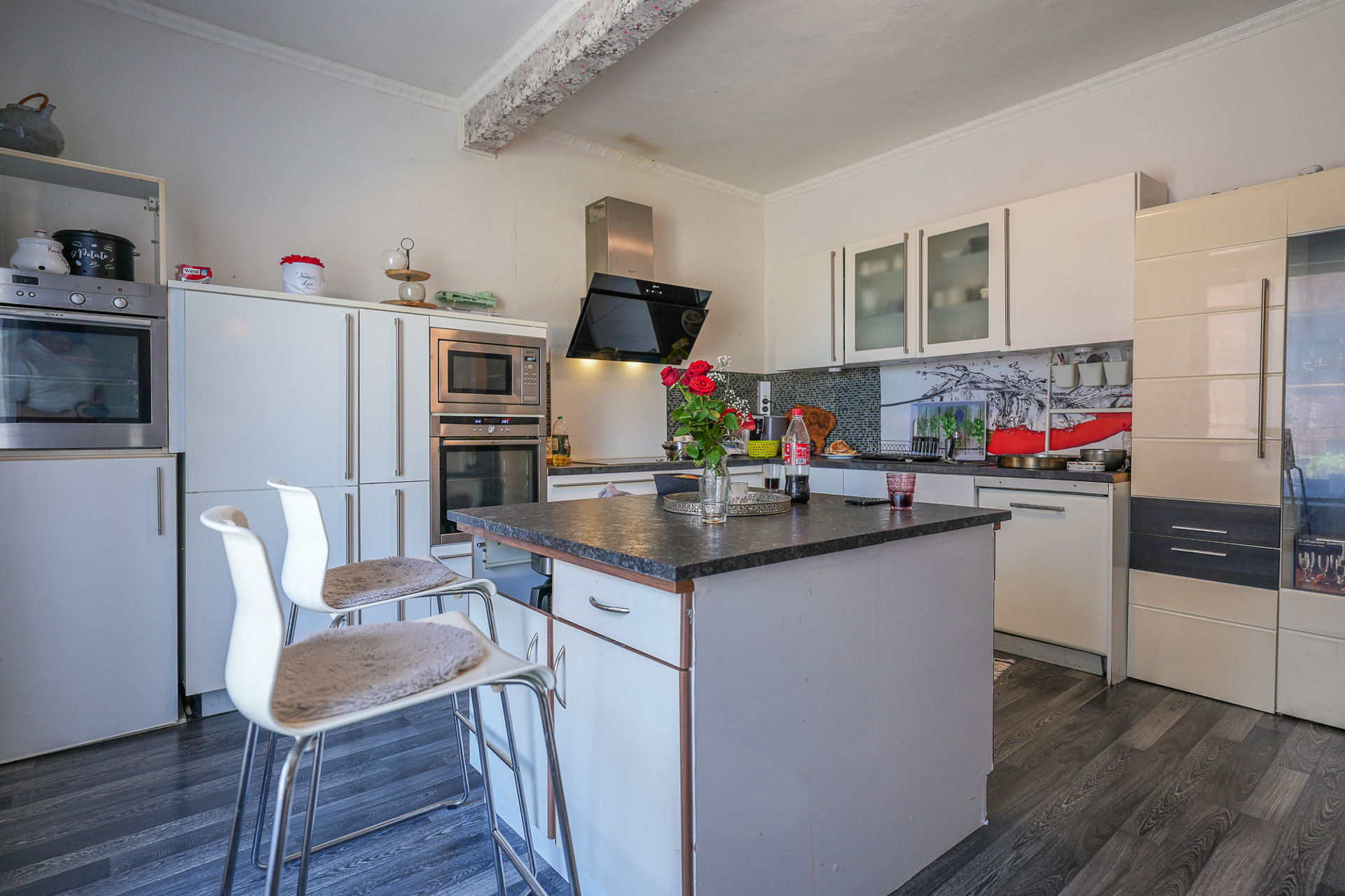 Mit einer großzügigen Wohnfläche von ca. 206 m² auf zwei Etagen ist hier genug Raum für große Familien oder mehrere Generationen. Im Erdgeschoss beeindrucken hohe Decken, die den Räumen Weite verleihen. Die große, einfache Küche lädt ein, gemeinsam zu kochen, zu reden, Zeit miteinander zu verbringen. Ein angrenzender Essbereich mit Zugang ins Wohnzimmer und in den Innenhof bietet Platz für gesellige Stunden. Dazu kommen ein weiteres Schlafzimmer, ideal für Gäste oder größere Kinder, ein praktischer Hauswirtschaftsraum sowie ein Gäste-WC und ein Wannenbad mit kleiner Sauna – perfekt für die kleine Auszeit zu Hause.