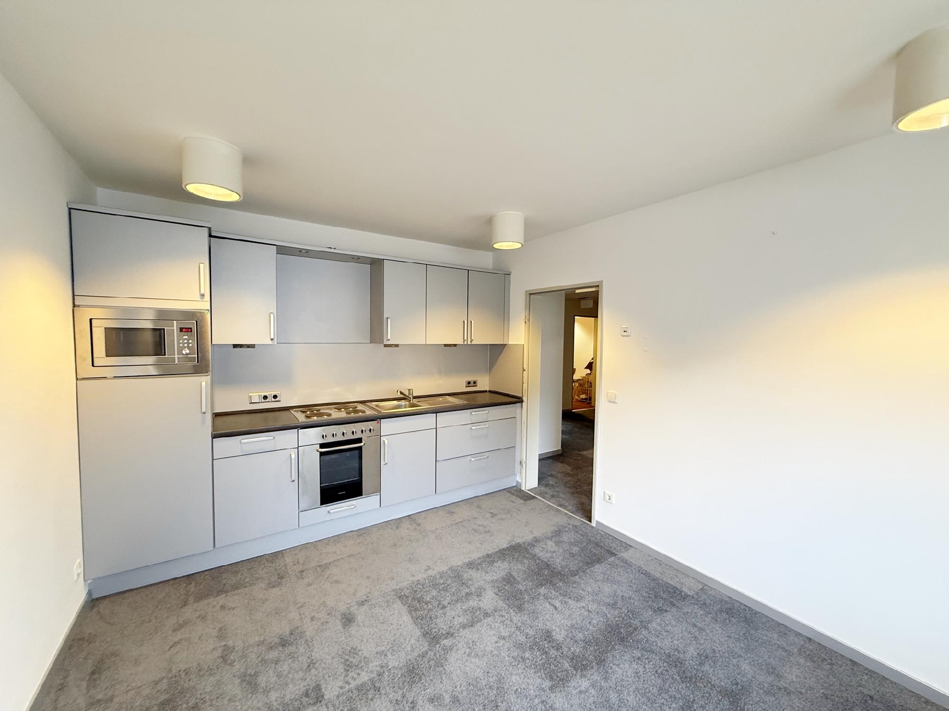 – Abgehängte Decken mit integrierten Leuchten und Lüftungsauslässen; robuste Bodenbeläge