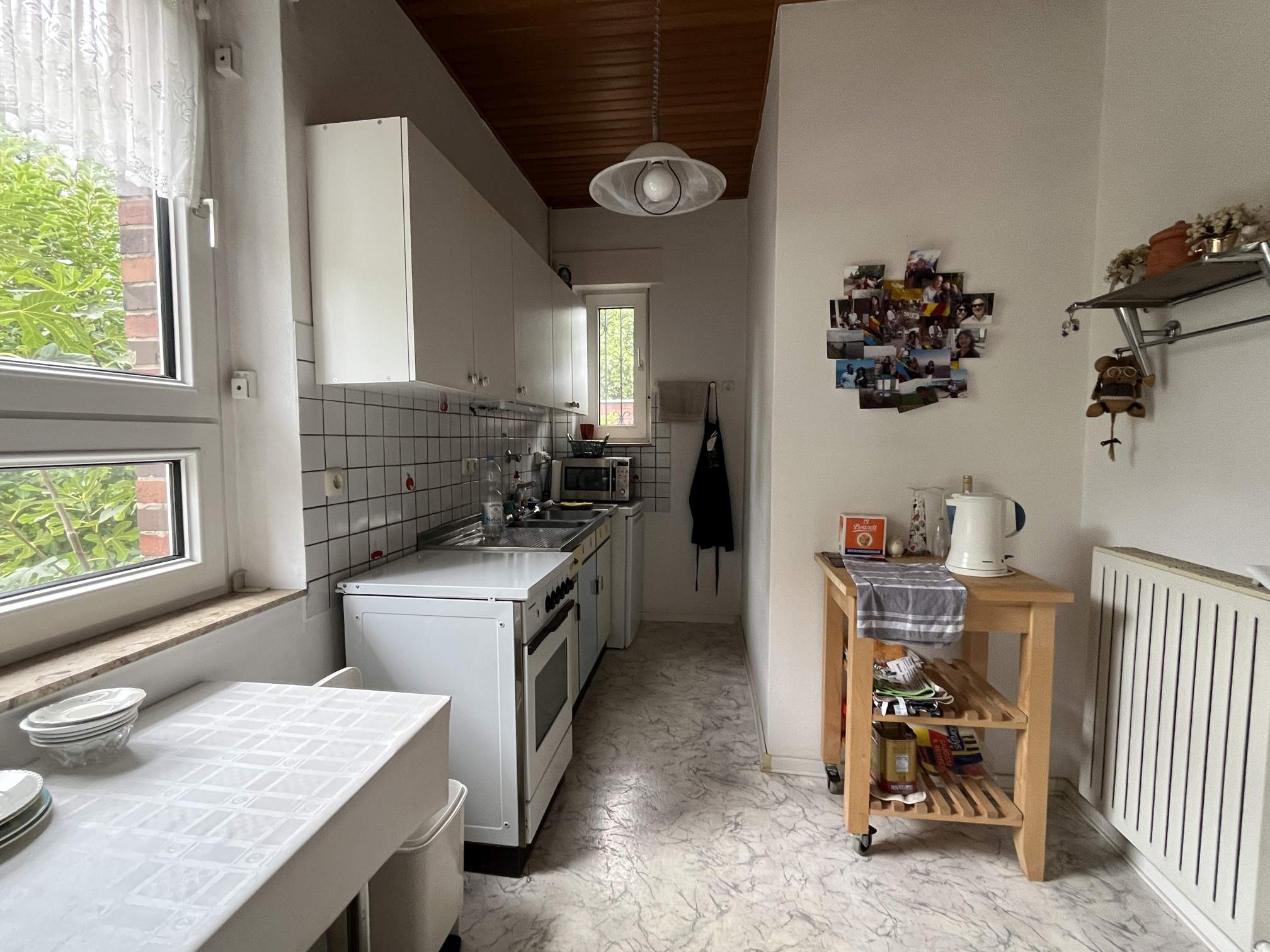 Die Innenausstattung des Hauses ist bereits älteren Datums, hier wird der Erwerber vermutlich die Böden und die Bäder erneuern wollen. Positiv zu erwähnen ist, dass der Dachstuhl vor ca. 25 Jahren neu gemacht und gedämmt wurde und die modernen Gas-Thermen aus 2011 bzw. 2021 stammen. Auch die Fenster sind bereits isolierverglast und aus weißem Kunststoff. Hier besteht u. E. nach kein Handlungsbedarf.