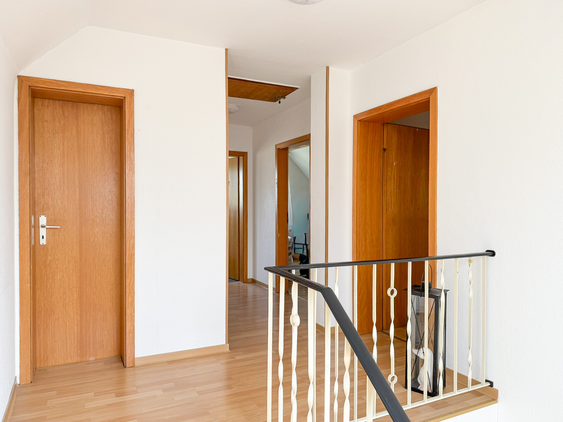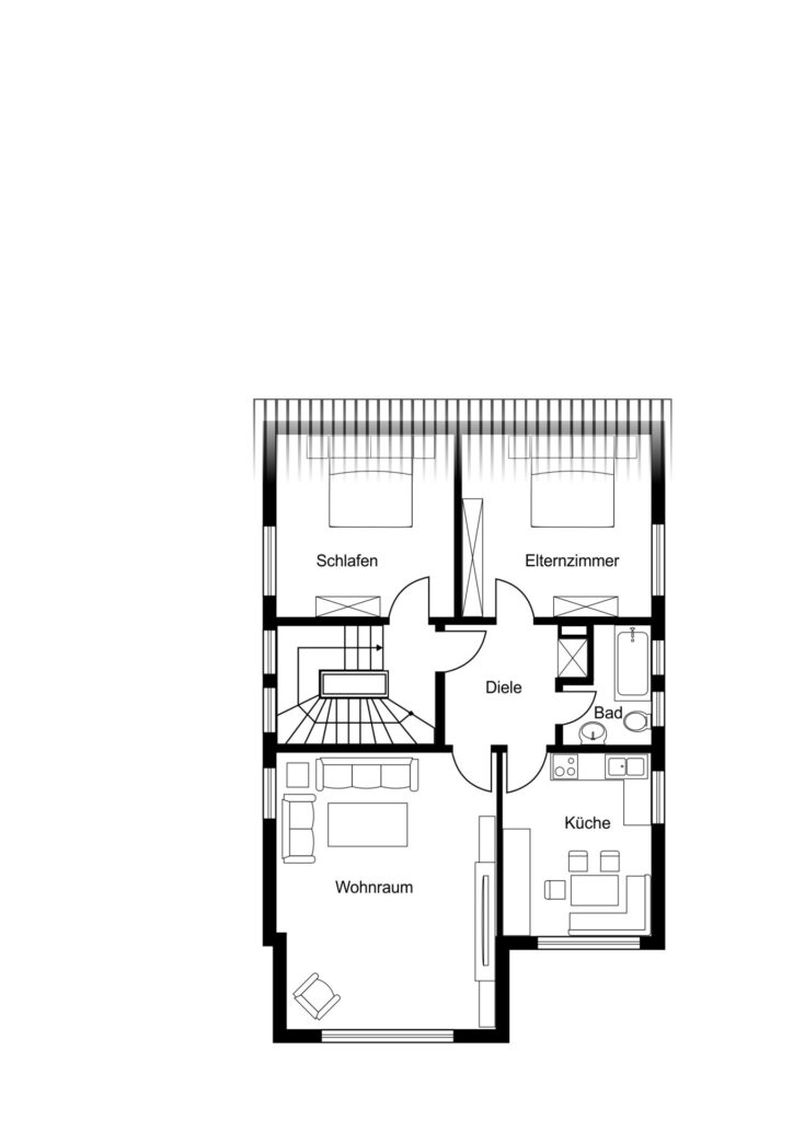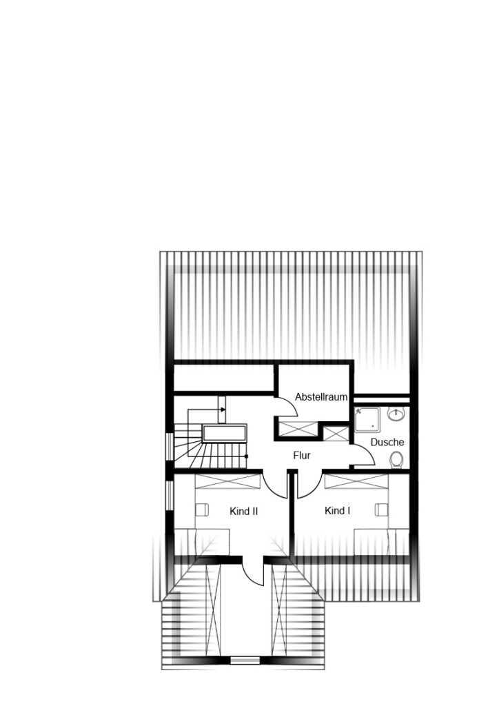 Die zweite Wohneinheit erstreckt sich über das Obergeschoss und das Dachgeschoss und umfasst ca. 117 m², welche sich auf 5 Zimmer verteilen. Die Räume des Dachgeschosses sind separat über das Treppenhaus zugänglich, wobei die Fläche im Obergeschoss ca. 82 m² umfasst und die im Dachgeschoss ca. 35 m².